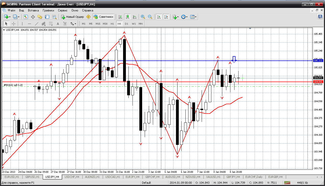 И на последок еще доллар - йену посмотрел. Ну что еще разок стрельнет вверх, в фигуру 105, но не далеко. И у меня как раз там на 105.11 проходит приличное внутредневное сопротивление. Поэтому есть предложение по этой цене продать пару. Да и стоп лос не очень большой получается (за 105.43), а вот перспективы вниху очень даже приличные получаются. Прикрепленные файлы: