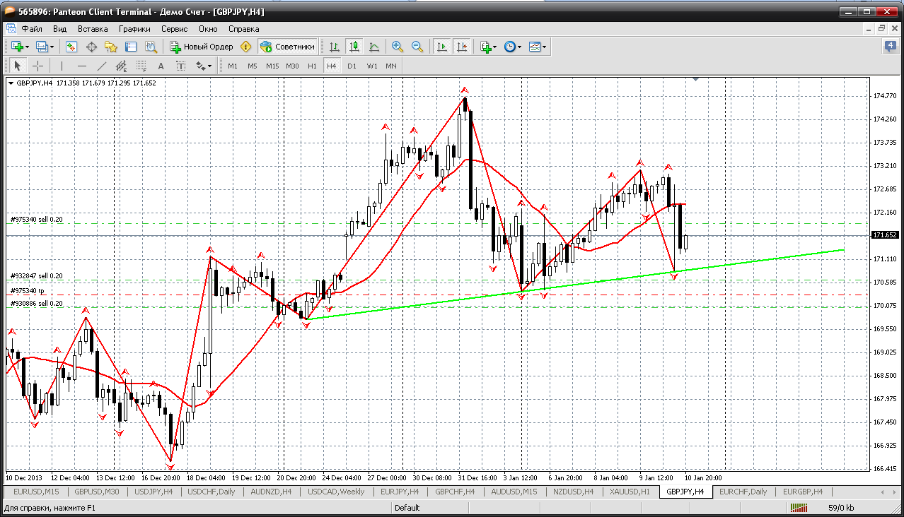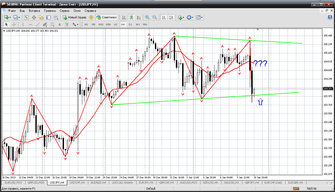 Далее доллар-йена. Вот с этой парой надо быть осторожней. Не очень понятны её долгосрочные перспективы....Сейчас достигли нижнюю границу канала на Н4 и куда пойдем дальше? Пока думаю, что в понедельник начнем с роста, но не очень длительного. Пока до мувинга, (все на том же Н4), а это не выше 104.80....а там возможно и продолжения роста (по тренду) и возврат вниз на штурм низов.... Прикрепленные файлы: