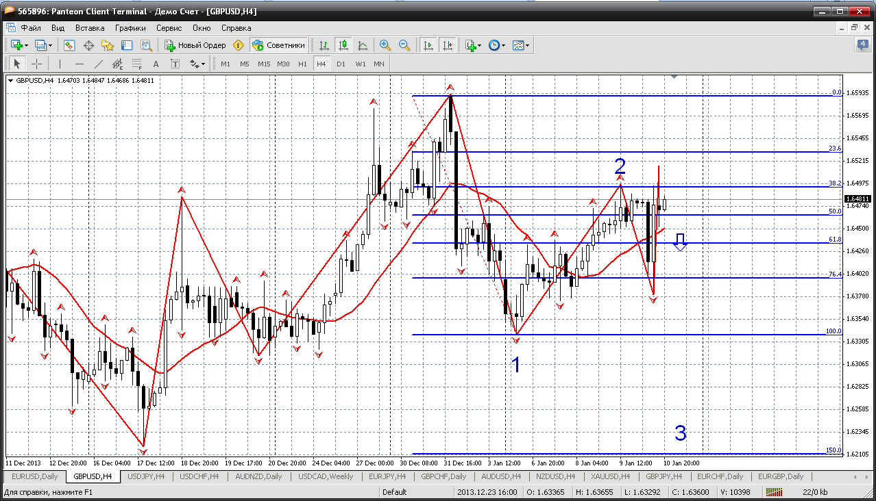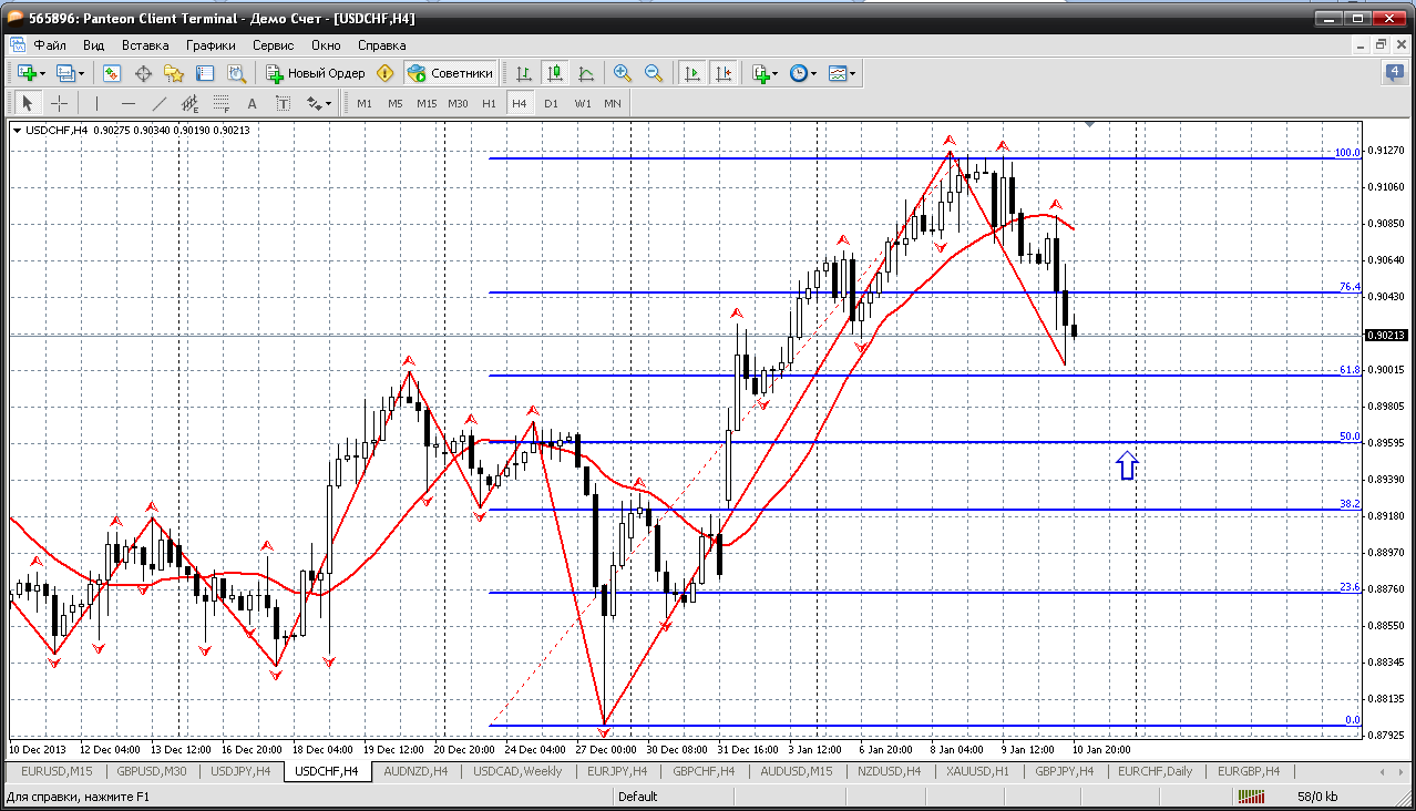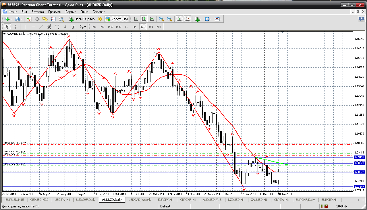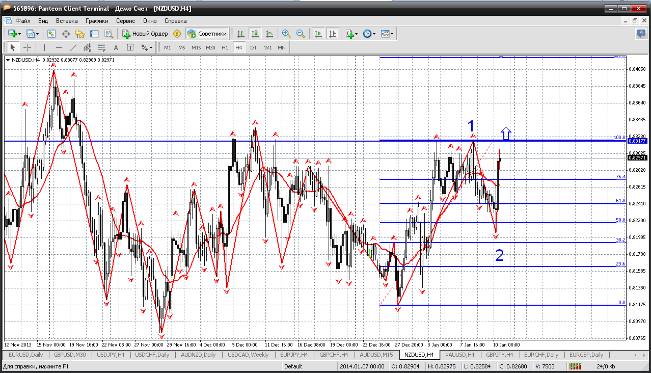 Далее - австралиец. Эту пару на следующей неделе при любых откатах только покупать. Сейчас цена движется в восходящем канале, закрепилась выше мувинга и цели роста 0.9044 (там 161.8 % по фиборасширению). Кстати, удивительное дело - полная корреляция с НЗД. У меня так получается. Прикрепленные файлы: