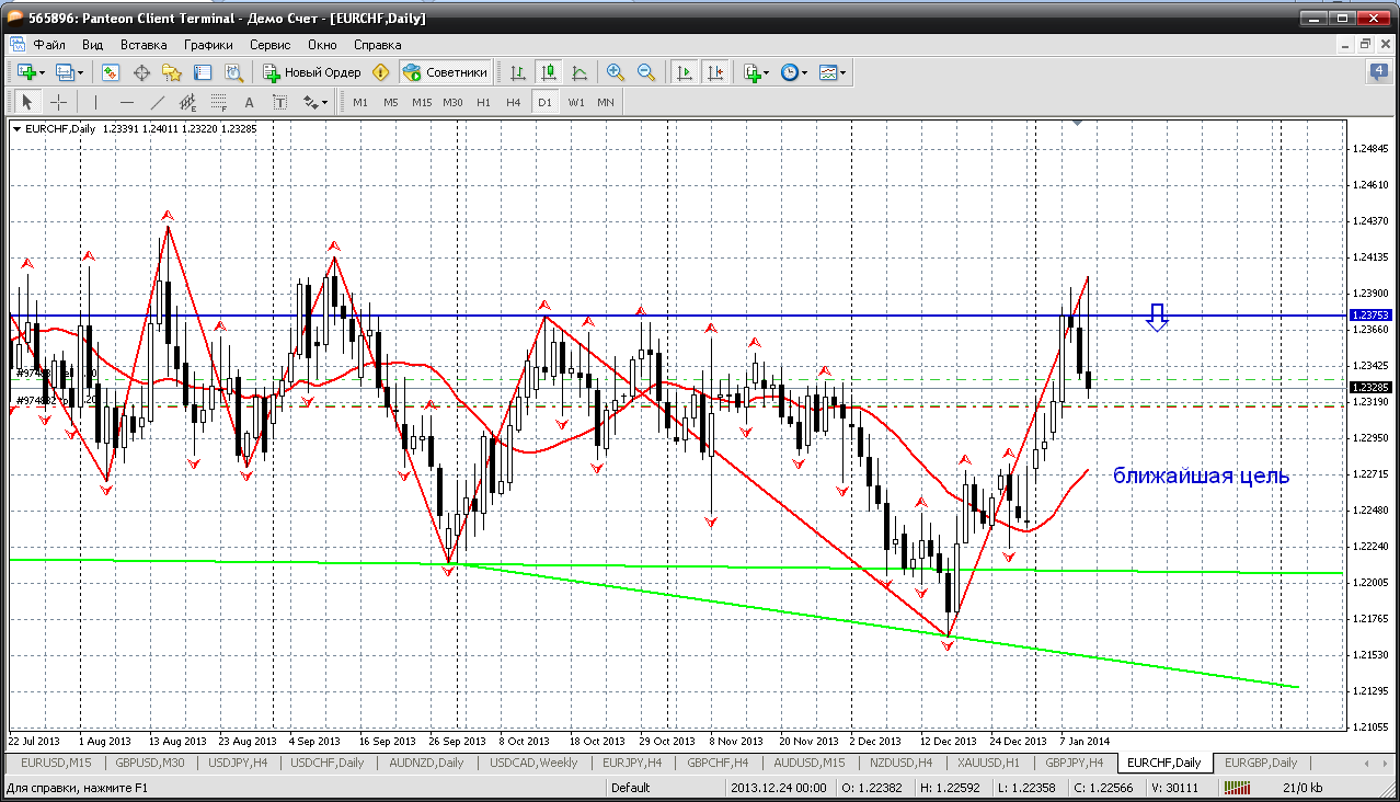 Евро-франк...здесь приверженцы трендовой торговли видят только продолжение роста и только покупки. Я не согласен с этим мнением. И вот почему. Цена на самых вершинках последнего времени.....три свечи на дневке медвежьи и у меня есть желание только продавать пару внутри дня от сильных сопротивлений. И ближайшая цель снижения 1.2280, а может быть и ниже (на скрине эти цели хорошо видны).. Прикрепленные файлы: