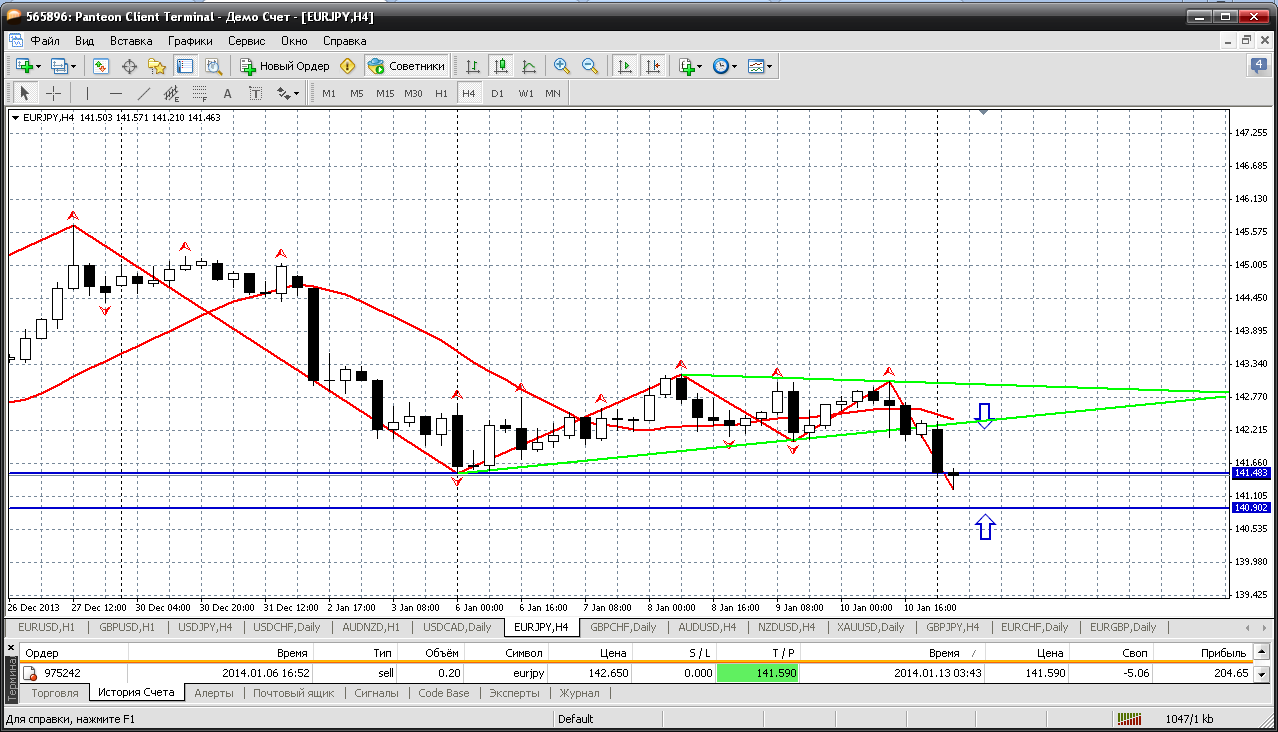 Евро-йена...13.01...начала день приличным падением и цена достигла первой поддержки внутри дня 141.48. Продажи можно закрывать, а вот покупать, считаю, рановато. Это все таки евро-йена. Для покупки надо дождаться теста фигуры 140 и от 140.91 (приличная, более сильная поддержка внутри дня) - покупать.