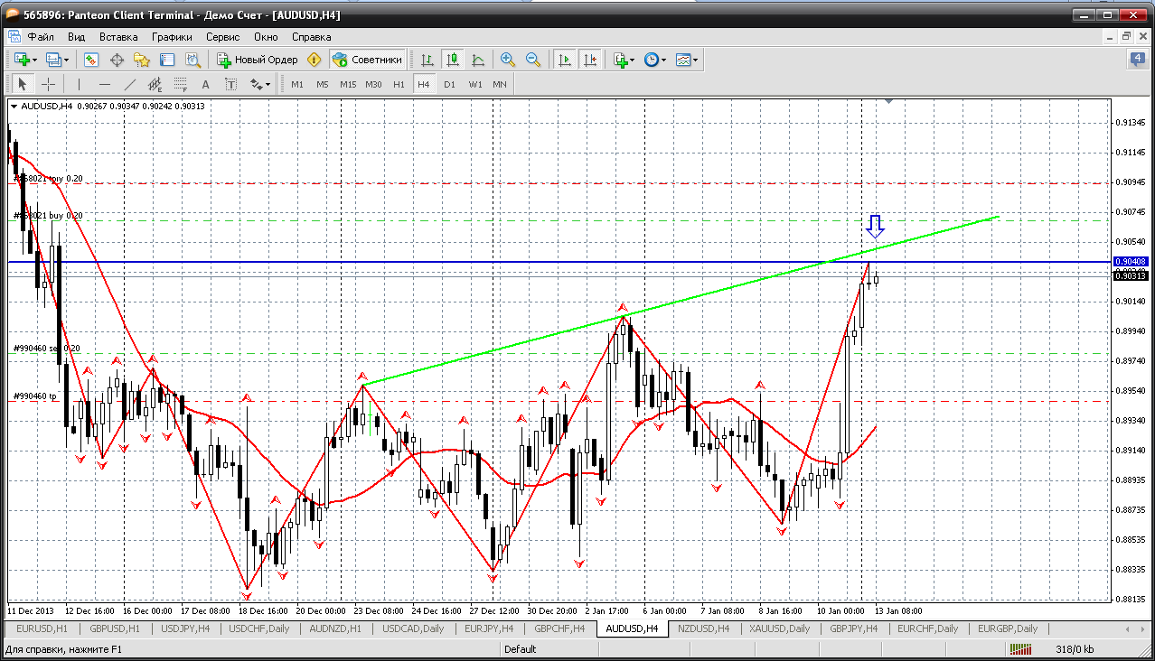 Предлагал в планах на выходных покупать при любых откатах вниз австралийца. Но он очень бодро отторговался на азиатской сессии и не дал никаких откатов, а закрепился в фигуре 0.90 и даже достиг первого сопротивления 0.9041. Но ожидаю теста трендовой на Н4 (0.9051) и от неё продавать начну, не раньше.... Прикрепленные файлы:
