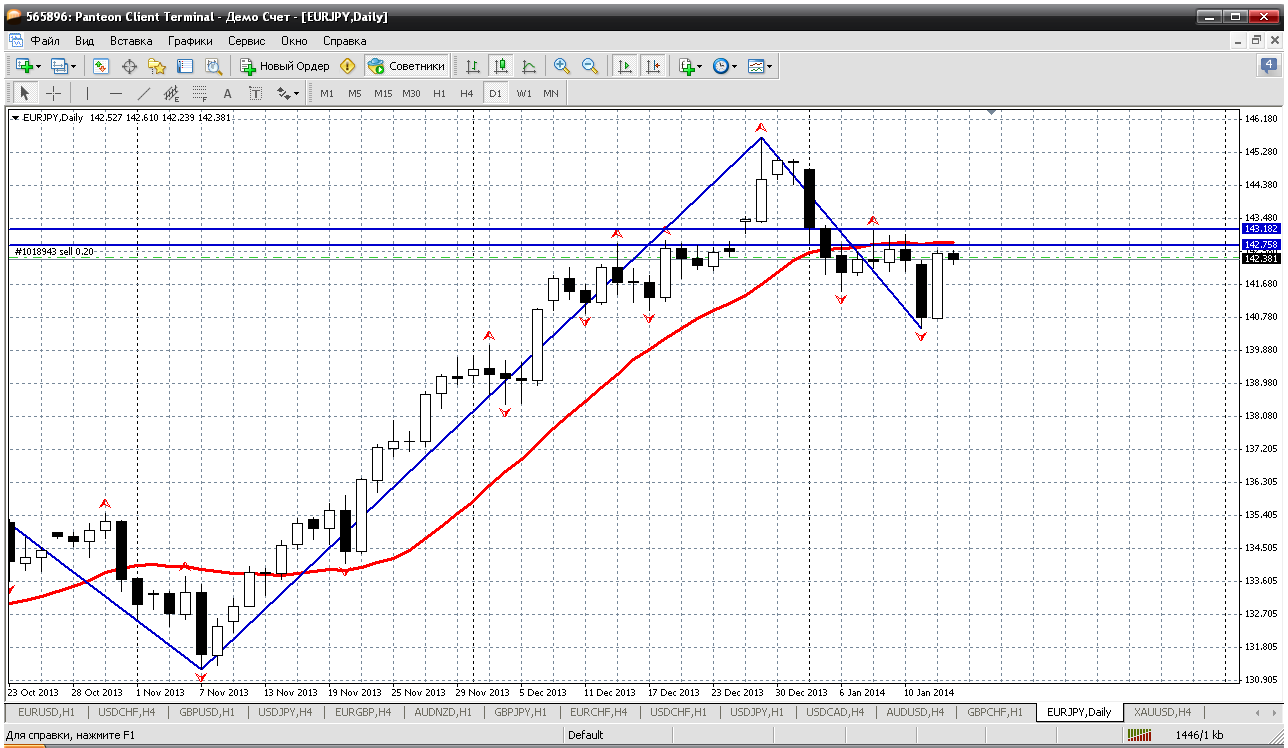 Евройена на очереди...вчера изобразили на дневке поглощение, но пока не пробили и не закрепились выше дневного мувинга, пробуем продавать. Первая продажа сегодня как раз от этого мувинга, 142.76. В принципе вчера цена хорошо откорректировалась после падения. Следующий уровень - 143.18 - первое сопротивление внутри дня, там добавлю еще продажу... Прикрепленные файлы: