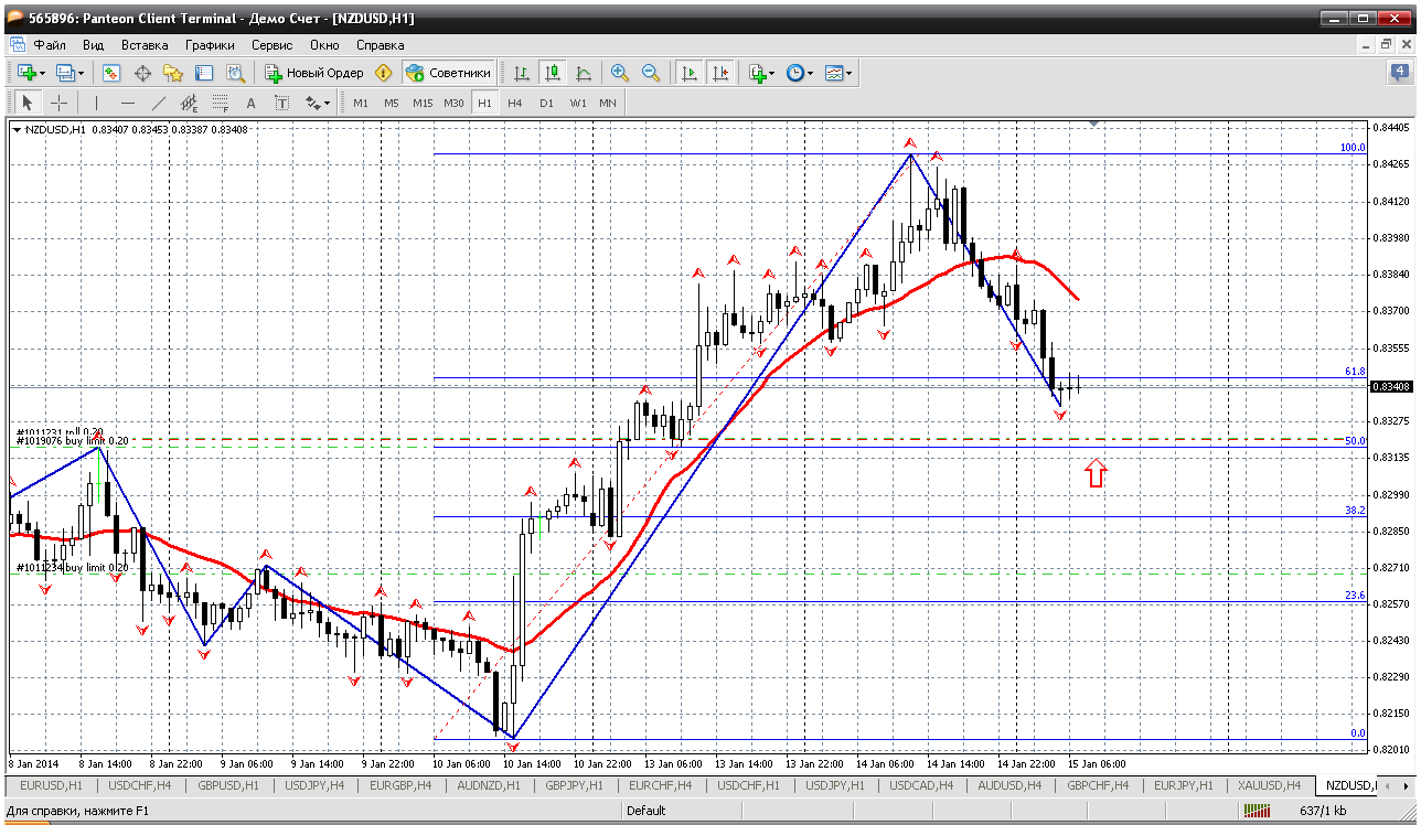 Далее - НЗД. Тут опять происки соседа (австралийца). Пара росла и вроде ничто не мешало достигнуть цели своего восхождения - 0.8450. Но тут резкое падение (опять, думаю из-за солидарности с австралийцем). Но, есть подозрение, что все это лишь коррекция перед дальнейшем ростом. Получается достигаем 0.8319 (50% откат) и пару покупаем. Такой мой план. Прикрепленные файлы: