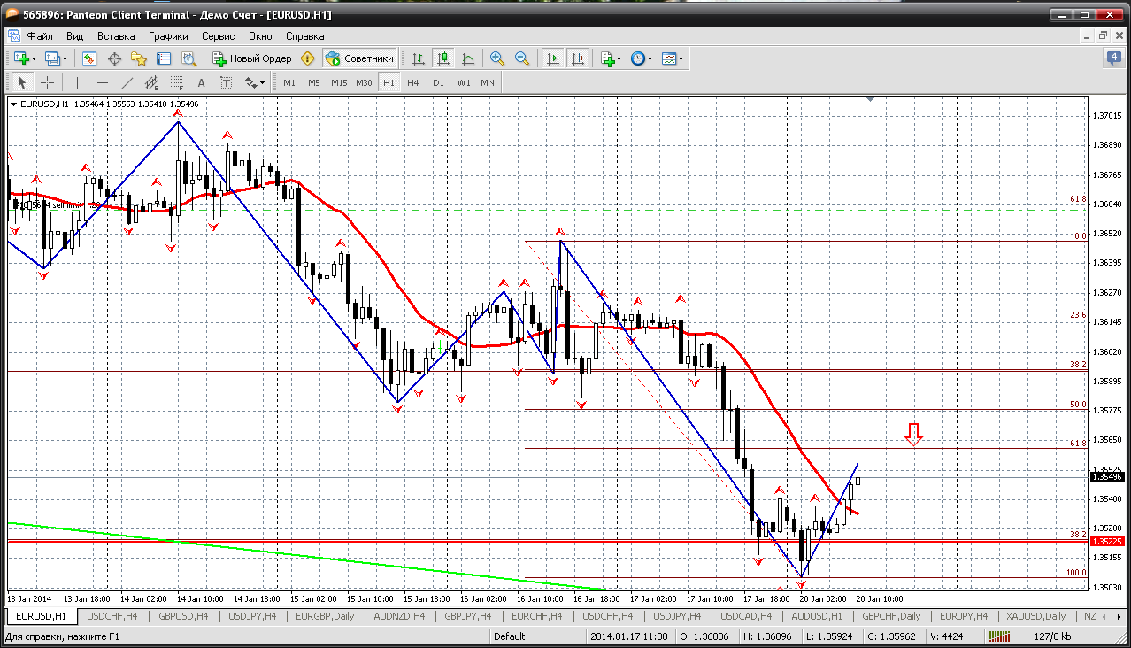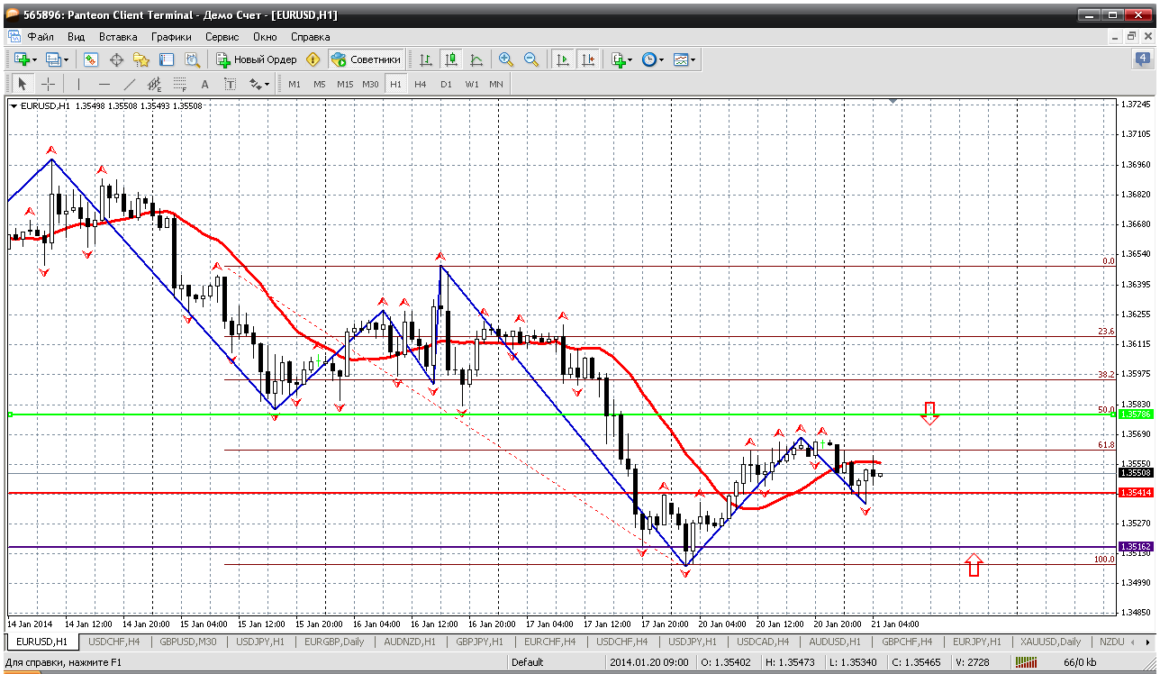 Евра....20.01... Пара попытается еще разок снизится и думаю сделает это от уровня 1.3560....оттуда и продавать можно начинать. Это у нас и пивот сегодняшнего дня и уровень 38.2 % по фибоуровням. А то сопротивление 1.3602 пока дождешься....