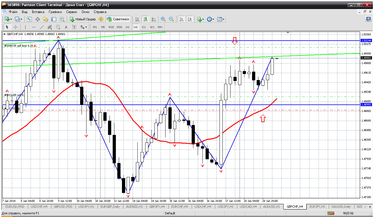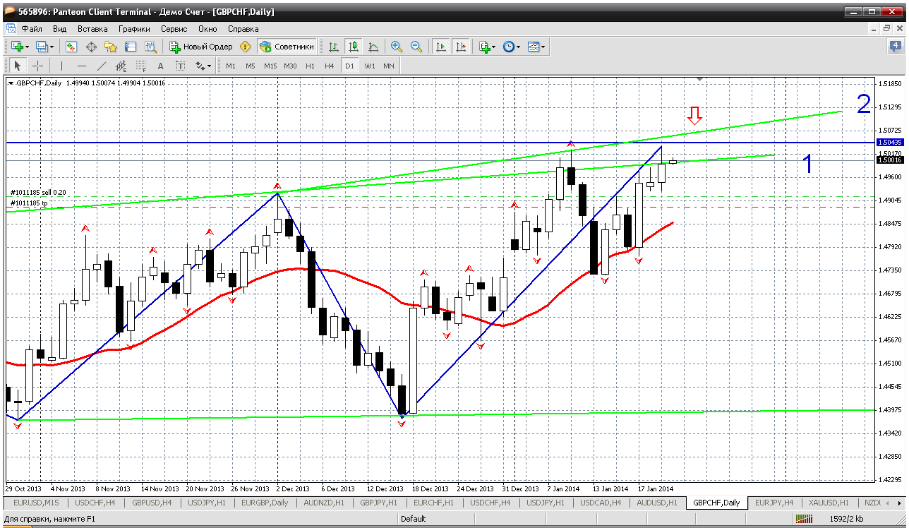 Фунт-франк. Оставим ту же тактику - продажи от вершинки. Вроде как цена пошла к трендовой №2 (примерно цена получается 1.5057). А вот внутридневное сопротивление (первое) у меня получилось 1.5043. Получается это очень приличная зона продаж. Продаем и не боимся. Только не жадничаем. Может оказаться, что пара надолго залезла выше 1.50.... Прикрепленные файлы: