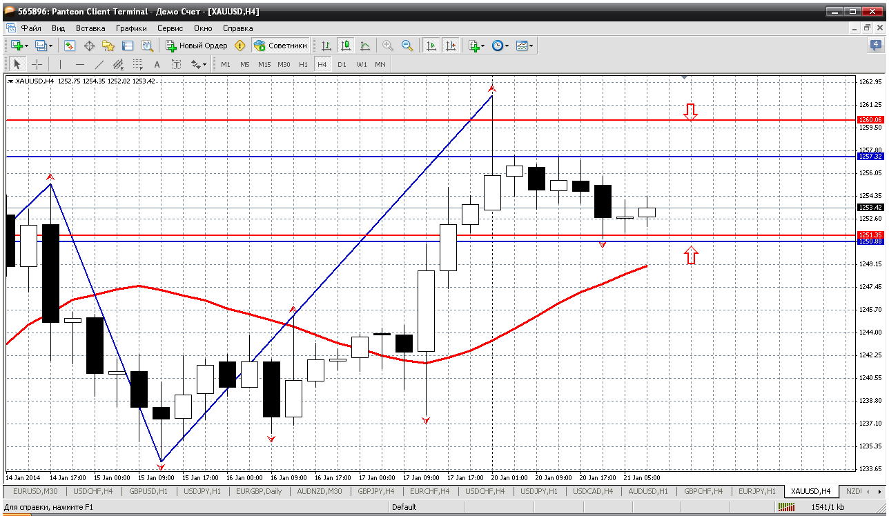 Золото.... Хоть и закрепилось выше 1251, но находится все в том же канале, с прошлой недели (на скрине границы канала у меня синего цвета). Так вот на сегодня внутредневные уровни ПС практически отображают эти границы.