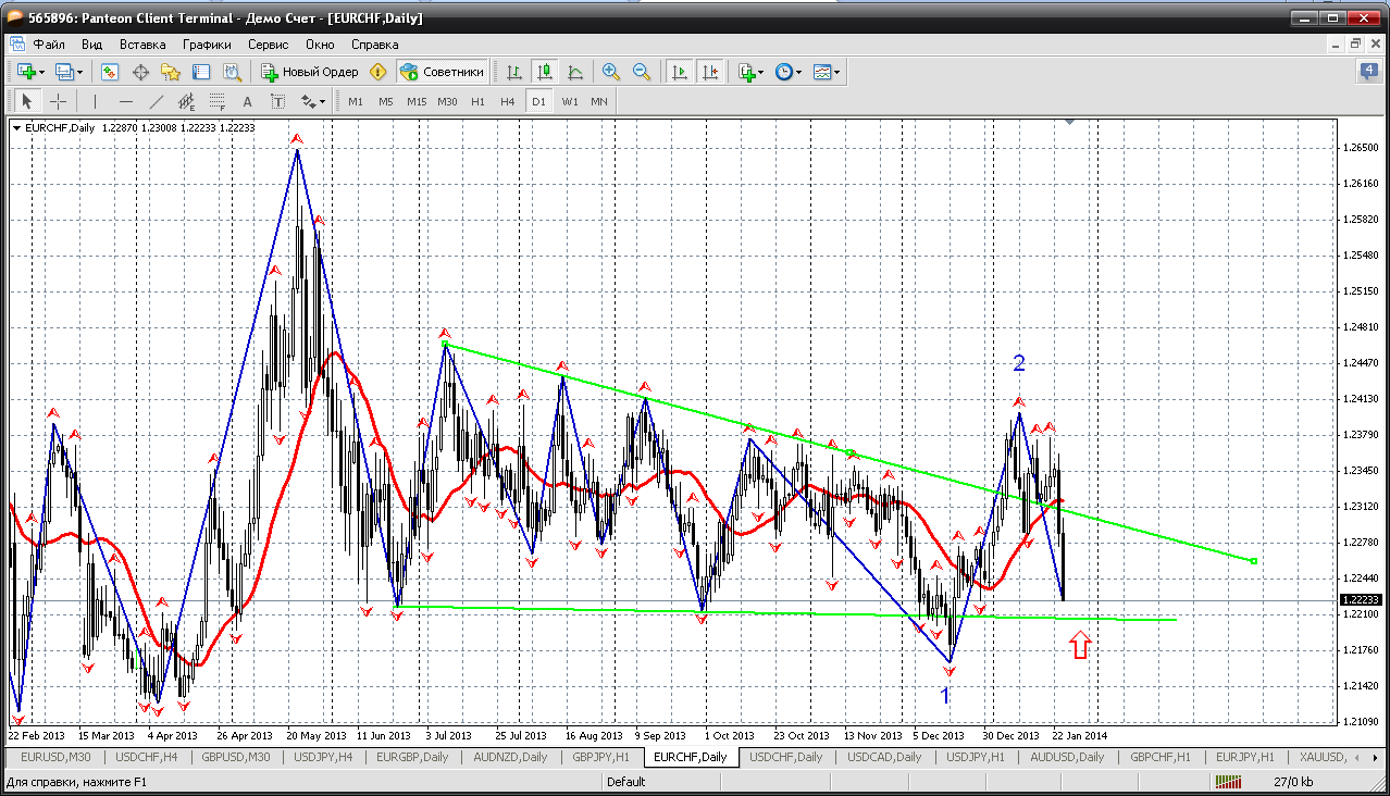Цена снова в своем старом коридоре (на дневке хорошо видно). Но в последнее время уже предприняла две попытки выскочить из него, но неудачно и цена снова возвращалась внутрь. А на следующей неделе ожидаю небольшое снижение в район 1.2210 (старая нижняя граница) и от этого уровня можно начинать цикл покупок пары. Прикрепленные файлы: