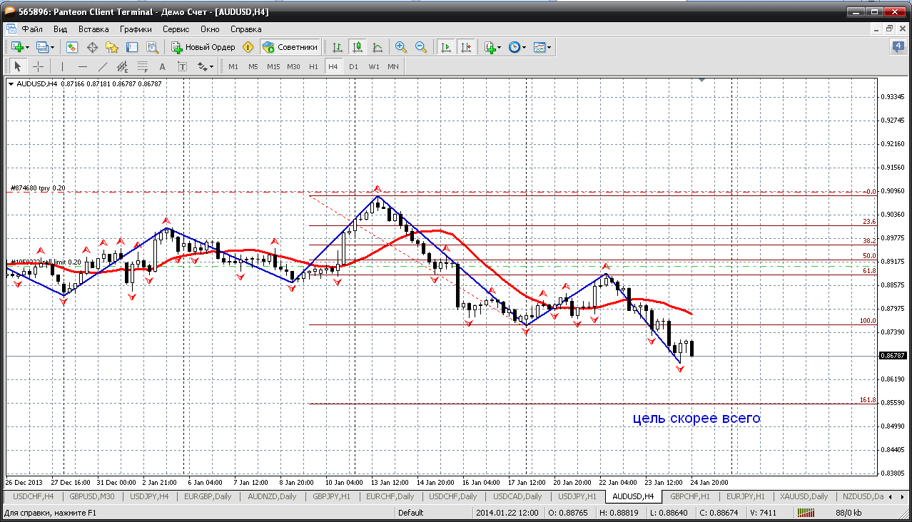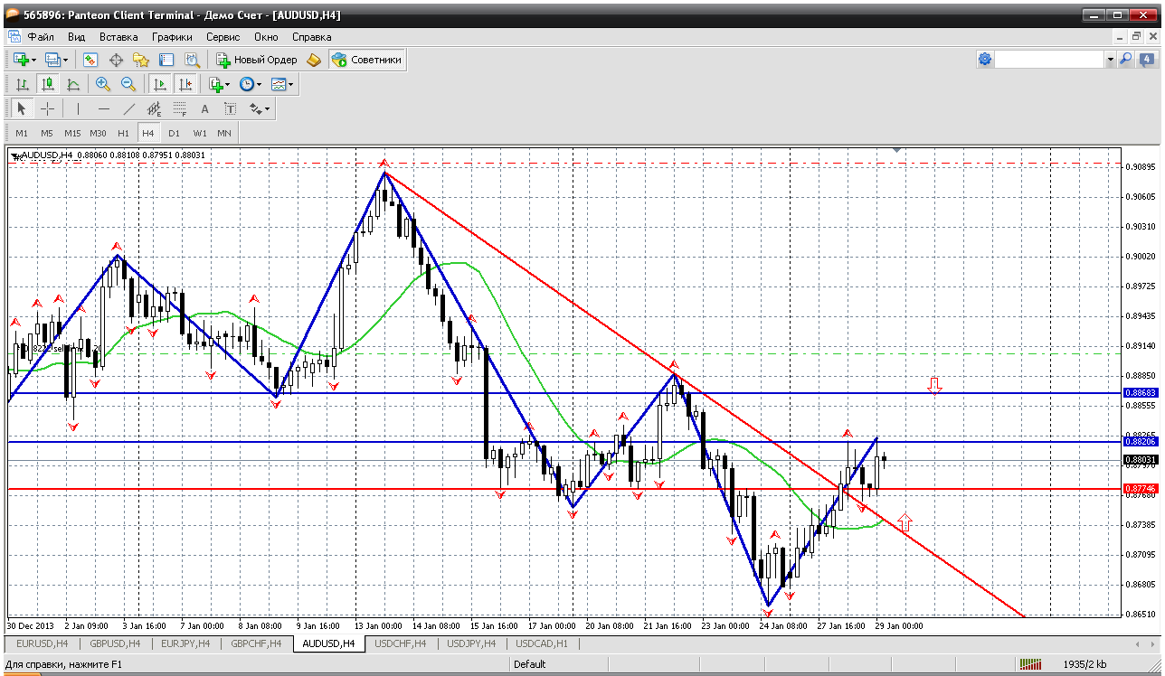 Австралиец на очереди....Этот "гусь трендовый" неплохо вверх смотрит. Купить его надо, но не с текущих, конечно. Откат нужен. Увидеть бы 0.8774 очень подходит для покупок: это и пивот, здесь же мувинг на Н4....не далеко трендовая. Считаю покупки от 0.8774 вполне безопасны. Это был бы подарок рынка...дадут ли? Прикрепленные файлы: