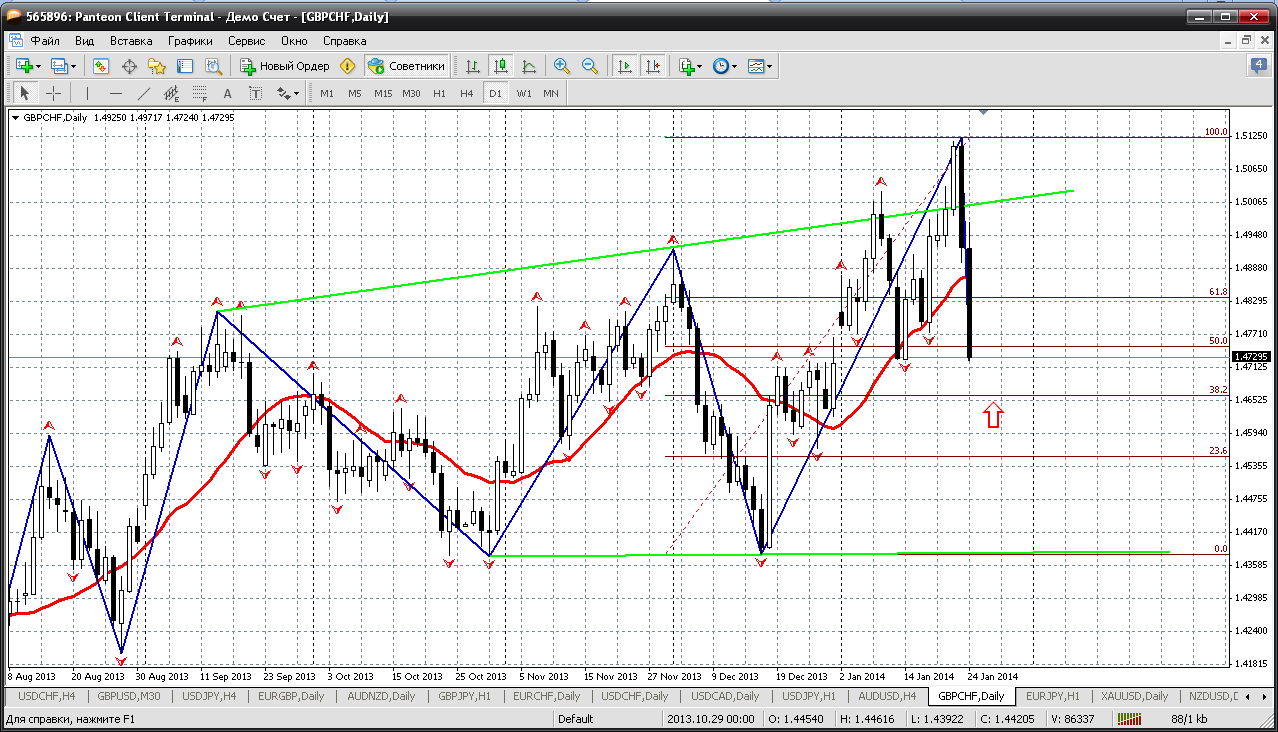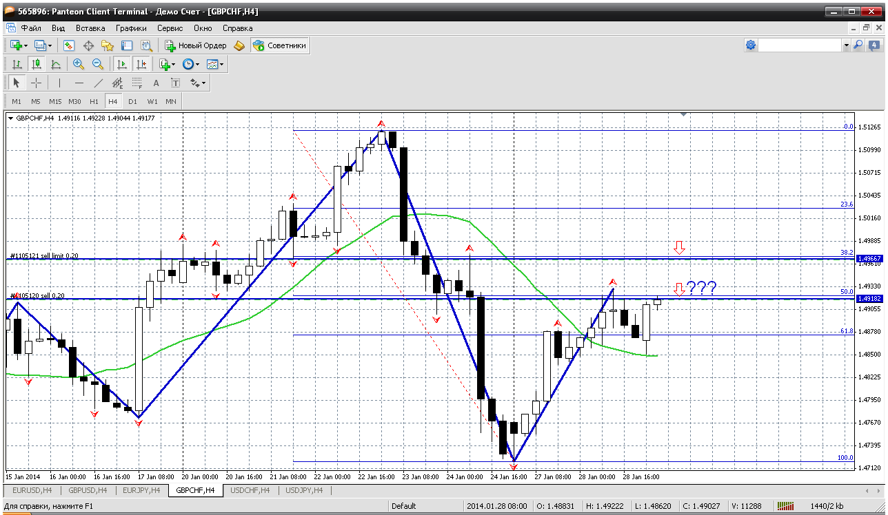 Далее фунт-франк. А вот этого красавца продаем прямо сейчас, с текущих. Цена достигла 1.4918. А это и сильное внутредневное сопротивление и 50% отката от последнего снижения....Получается продажа очень даже обоснованна. Более осторожно - это дождаться 1.4966 - 61.8% отката. Там безопаснее продажи. Но можем не увидеть такой цены.... Прикрепленные файлы: