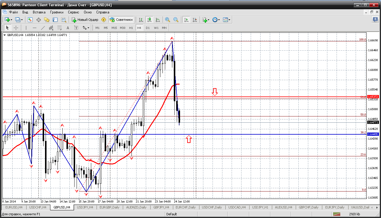 Фунт на понедельник, 27.01. Скорее всего по инерции еще снизится чуть-чуть. Примерно до 1.6449 и там цену уровень 61.8% по фибо оттолкнет вверх. Причем довольно серьезно оттолкнет. 1.6537 просматривается очень даже реально. А после его пробоя вполне возможен и возврат в фигуру 1.66 Прикрепленные файлы: