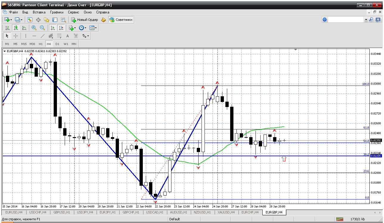Евро-фунт....тоже покупать желательно эту пару. Период роста она переживает. Ведь движение от 0.8168 до 0.8306 есть ничто иное как начало периода роста и это есть волна 1. Сейчас идет волна 2 (откат, коррекция) и надо дождаться уровня для покупки. И поддержки на сегодня: 0.8227 и 0.8210. Но покупать буду от 0.8220. Но это не просто так захотелось, это есть фибоуровень 61.8% отката от последнего роста Прикрепленные файлы: