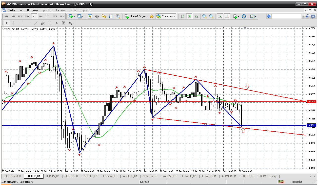 Фунт на 30.01....что то никакого воздействия на рынки не оказали вчерашние новости. Тогда обратимся к ТА. Пара уже несколько дней торгуется в нисходящем канале, который хорошо видно на Н1. И сейчас цена подошла к его нижней границе....а в этом районе сегодня расположена и первая поддержка - 1.6521. Думаю, что от 1.6512-1.6516 вполне можно пару прикупить. Вроде реальна покупка от этого уровня.... Прикрепленные файлы: