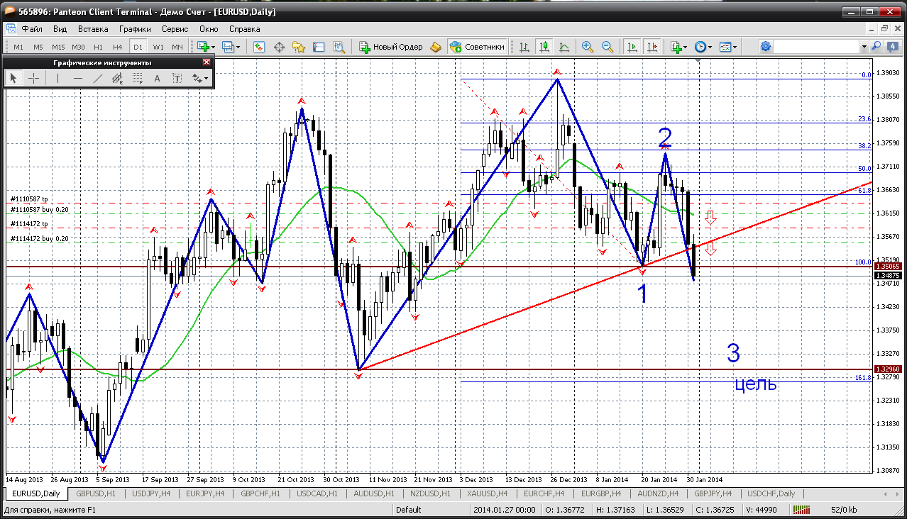 Ярко виден разворот основной тенденции: с восходящей на нисходящую. Смотрим:пробит уровень 1.3507), т.е. фигура 1.35 пройдена...и на графике виден зиг-заг на 1 - 2 -3 и цель его 1.3295. На этом уровне и 161.8 % по фиборасширению и лоу от 07.11.2013г. На лицо два момента, которые будут притягивать к себе цену..... Но знаем, что цена не идет по прямой. Сейчас напрашивается коррекция. Вариантов два: 1. к 1.3560 (пробитой трендовой линии).... 2. к 1.3615 (пробитому мувингу)...... и после этих откатов, продолжение снижения....Я так думаю. Прикрепленные файлы: