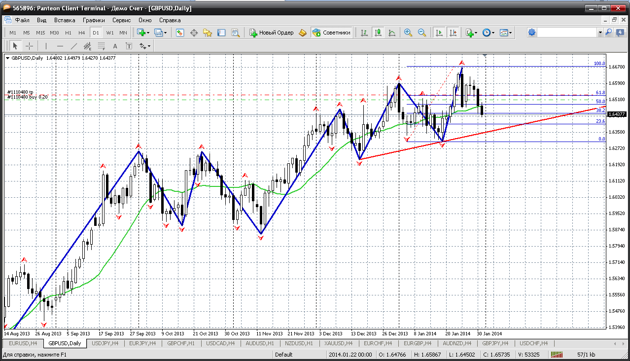 У фунта на дневном ТФ несколько иная картина.... Снижение прошло, но все это снижение входит в рамки коррекционного движения. Сейчас цена как раз на уровне 61.8 % отката по фибо ( рассматриваю дневной график), а также не далеко проходит и трендовая, до которой пипсов 70 осталось. То есть снижение в район 1.6360 еще очень даже вероятно. А вот потом - рост....это такая ситуация на графике. График - дневной. А как будет? Посмотрим в понедельник Прикрепленные файлы: