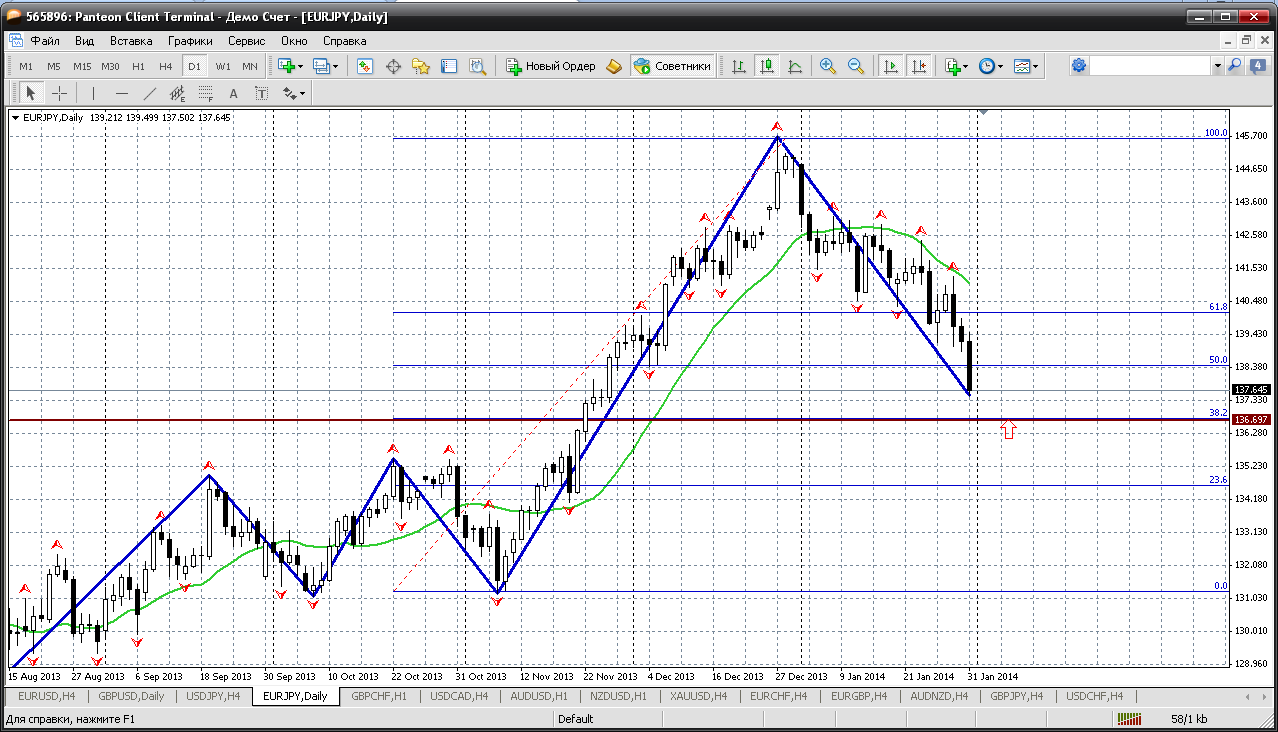 Далее, наша "восточная красавица" - евро-йена. Это пара переживает период коррекции. Тренд (основное движение) - на север, в рост.....и хотя на всех ТФ (до дневного ТФ) ушли практически в отвесное падение, но дневка нам показывает - коррекция, откат. Не более того. Осталось чуть чуть, пипсов 100 и от 136.69 рост возобновится. Уровень 61.8% по фибо очень любят для откатов йеновые пары. Прикрепленные файлы: