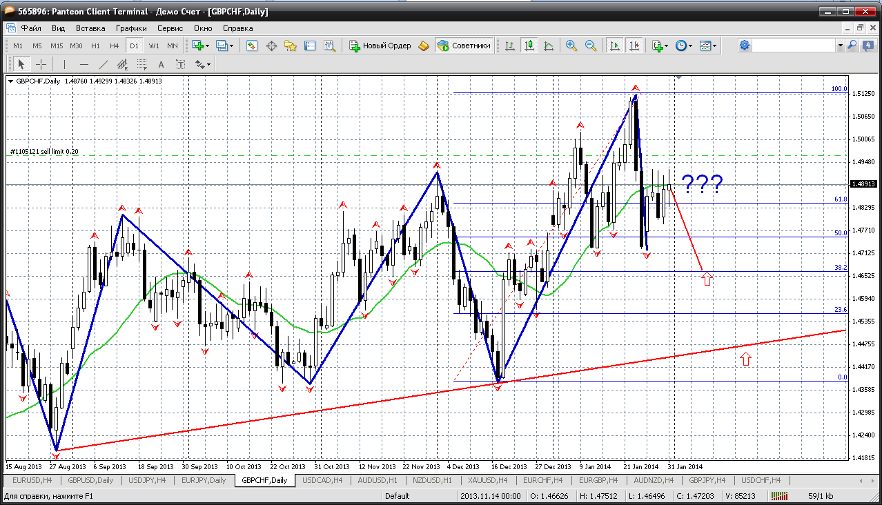 По фунт-франку на предстоящей неделе жду снижения. Всю прошедшую пытались пробить мувинг на дневном ТФ. Не получилось. Сколько еще можно пытаться? Значит нужен более глубокий откат. Сначала до уровня 61.8 % по фибо. А это у нас цена примерно 1.4660....прилично можно взять прибыли.....а если надумает до трендовой снизится (я не исключаю такой возможности), то получается можно ждать 1.4480.... Прикрепленные файлы: