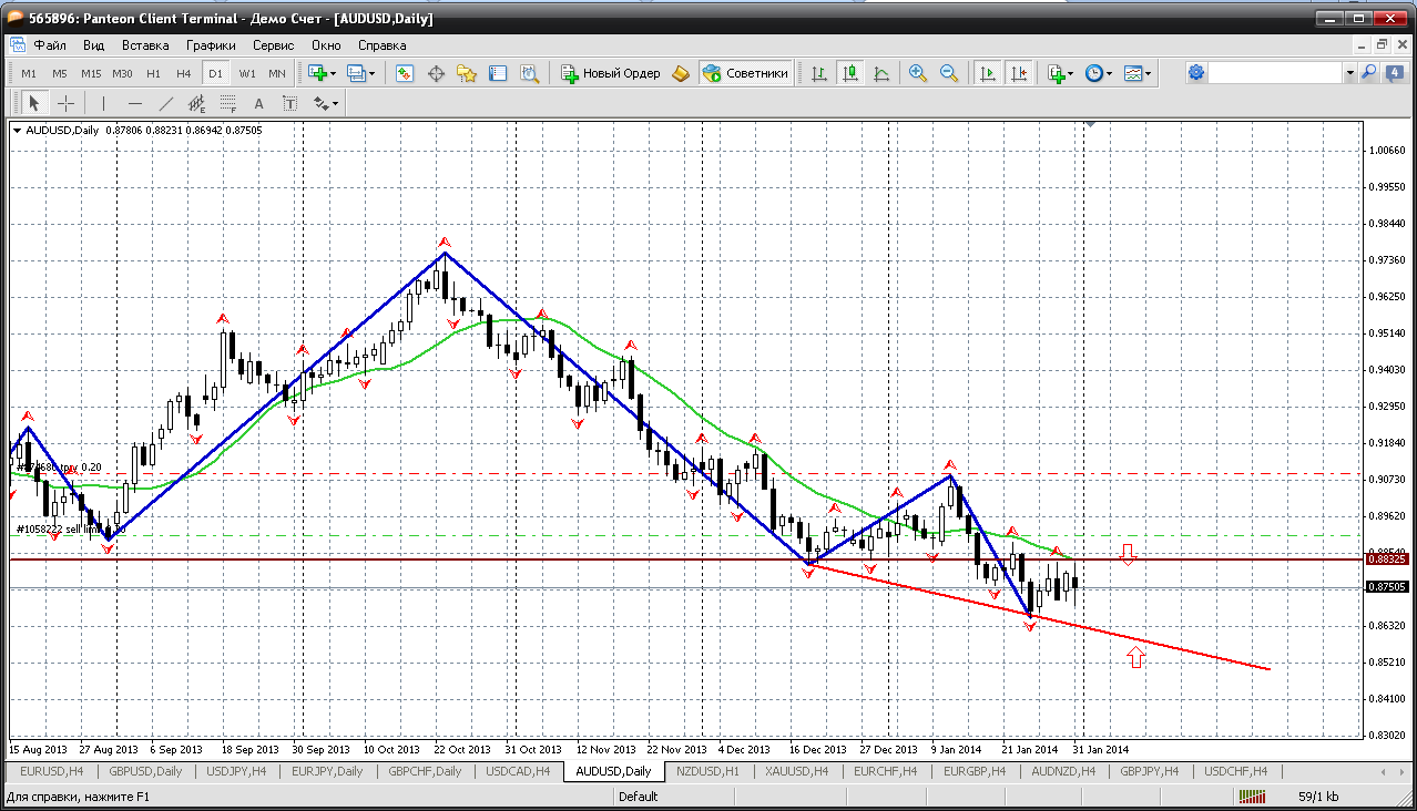 Дневной ТФ - если с текущих пойдем вверх, то подождать теста мувинга, который ни разу не протестировали на неделе прошедшей... так вот при его тесте, по цене 0.8832 пару можно продать (по тренду же ж).... если же продолжат снижение, то подождать 0.8620 (какой никакой пол на дневном графике), то осторожно попробовать прикупить.....пока так получается. Прикрепленные файлы: