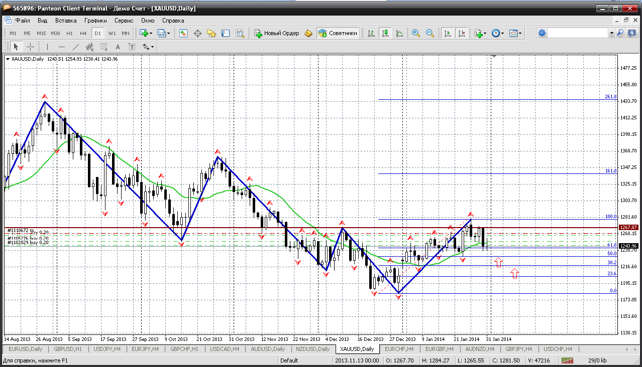 По золоту получается торговать только с просадками. Стоп лосы тут бесполезны (слив обеспечен - только постепенный). Когда цена закрепилась выше хая 1267 все ждали и я тоже ждал продолжение роста хоть до 1300....но золото резко и довольно серьезно пошло на откат и уже закрепилось ниже мувинга. Теперь можем увидеть и 1229 (50% отката) и даже 1218 (61,8%)...от него всего ожидать можно.... Прикрепленные файлы: