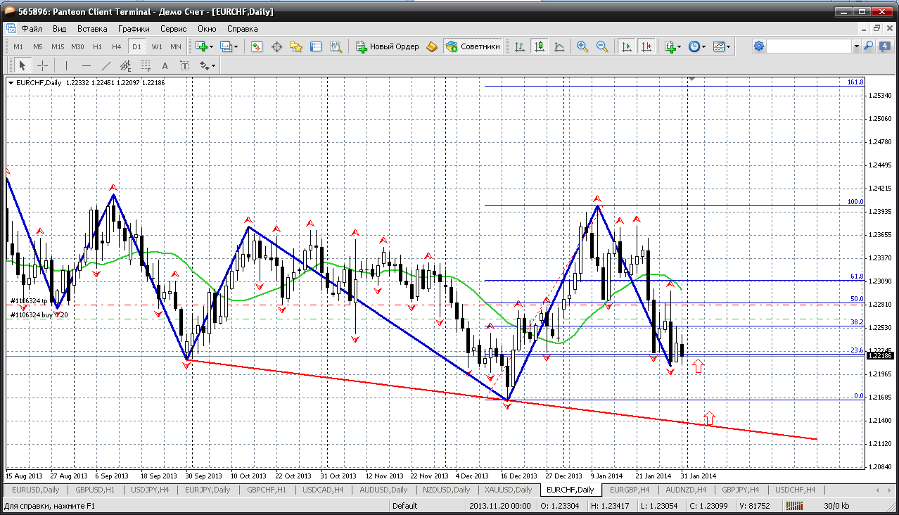Евро-франк...по этой паре ничего пока не изменилось. В фаворе покупки. Пока не закрепились ниже 1.2165 - основное движение на север, а сейчас идет откат. Вот и сейчас цена опустилась на очередной фибоуровень на откате и с открытия рынка вполне можно открыть покупку. И держать хоть до 1.2290....там цену мувинг встретит... Прикрепленные файлы: