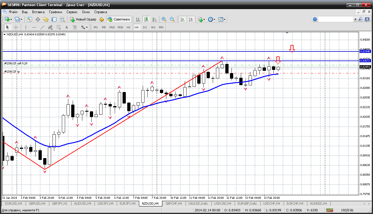 Далее - Новозеландец. Этой паре просто необходима коррекция. Поиссякли силы, толкающие пару вверх. Поэтому буду искать возможности для продажи. Сегодня у меня внутри дня получились два сопротивления - 0.8367 и 0.8394. Продажи от которых весьма перспективны. Если же достигнут 0.8394, то уж отметку 0.84 точно протестируют. От неё и продам. Практически безопасно. Прикрепленные файлы: