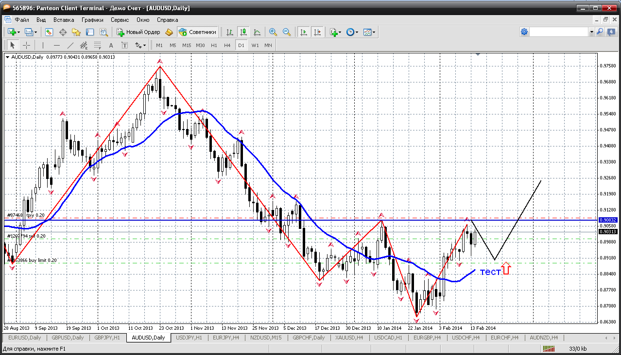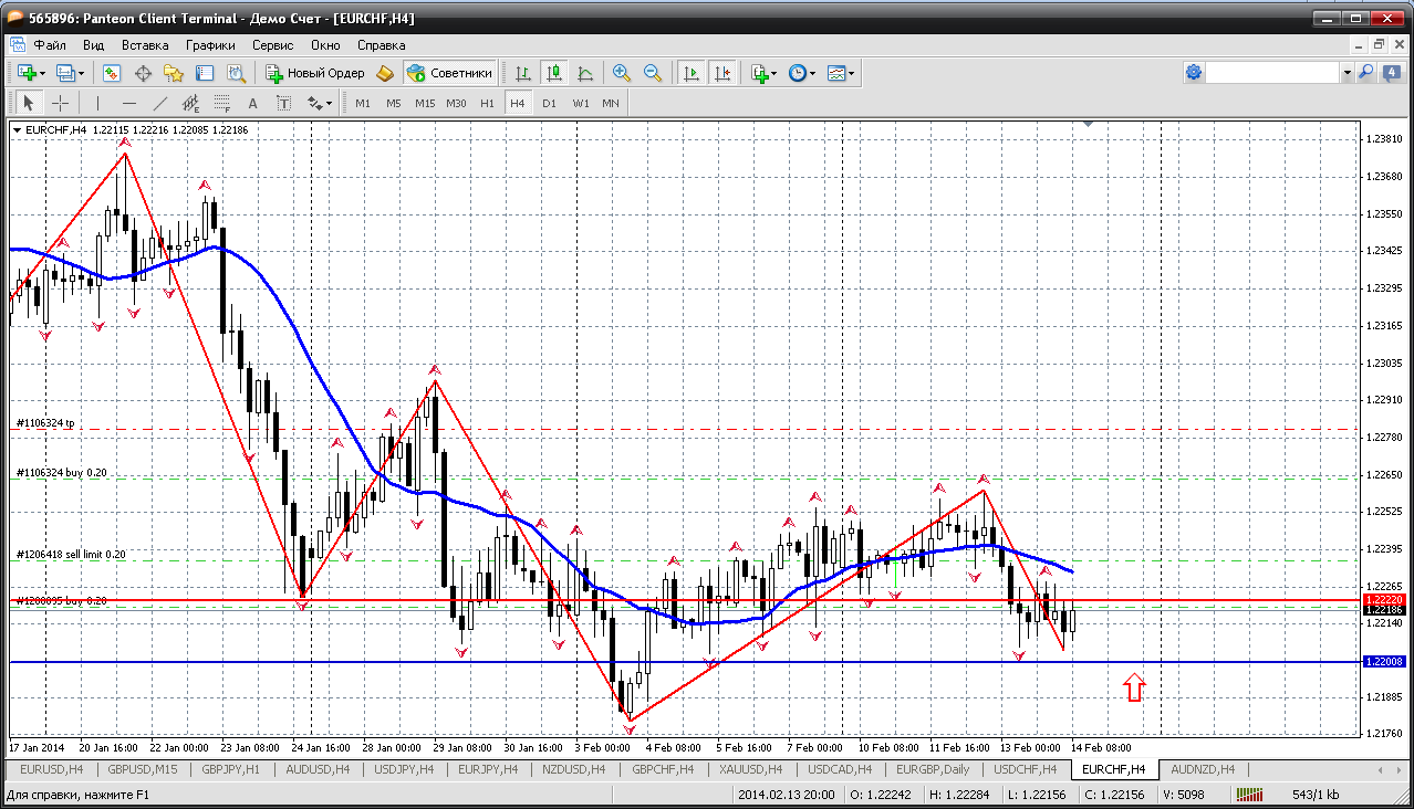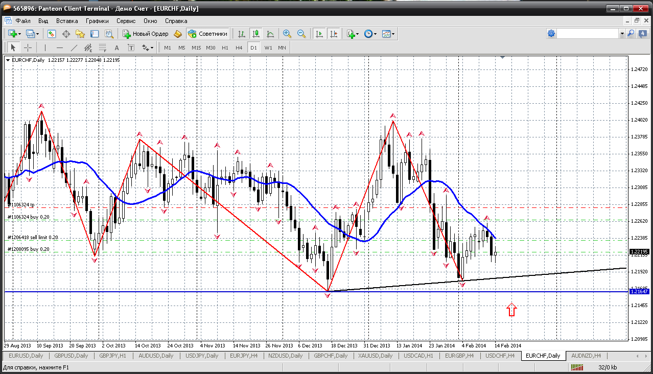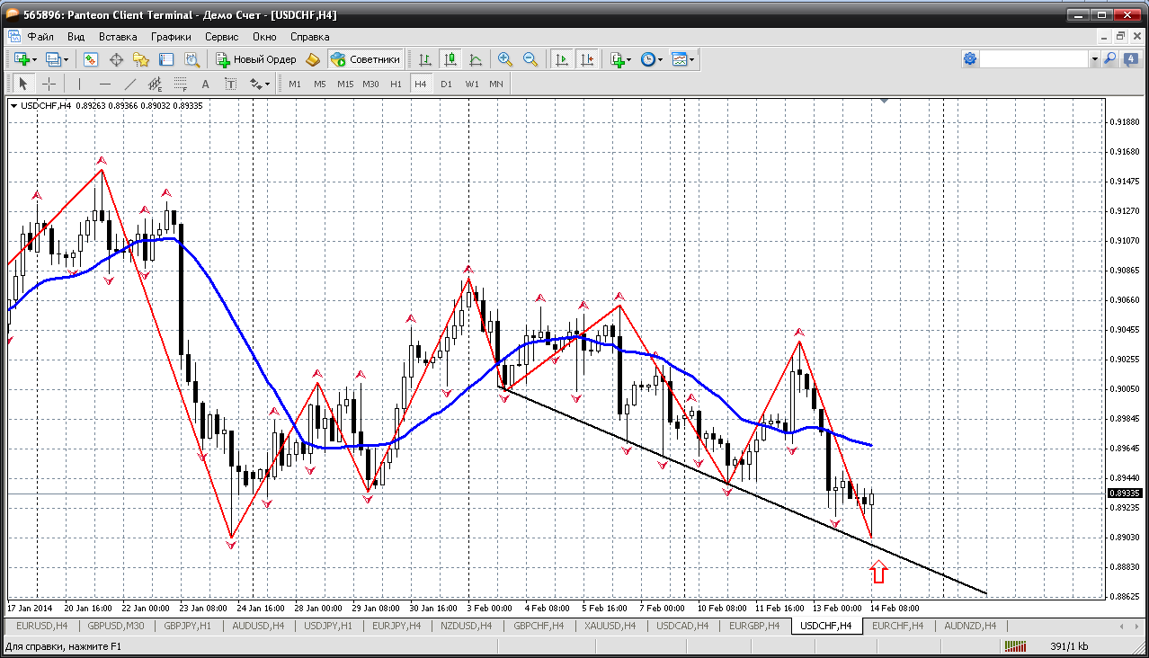 Доллар-франк....на сегодня планировал покупать от 0.8898. Это при тесте трендовой линии на Н4...и чуть чуть не дошли и ускакали вверх, но без меня. Я за рынком обычно не бегаю, значит сегодня по паре без позиций буду. Но отложку на покупку скорее всего выставлю... Прикрепленные файлы: