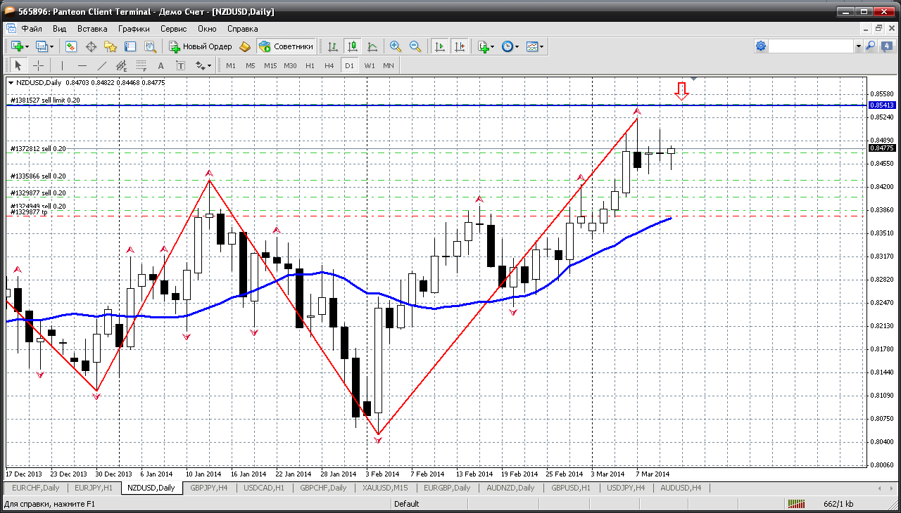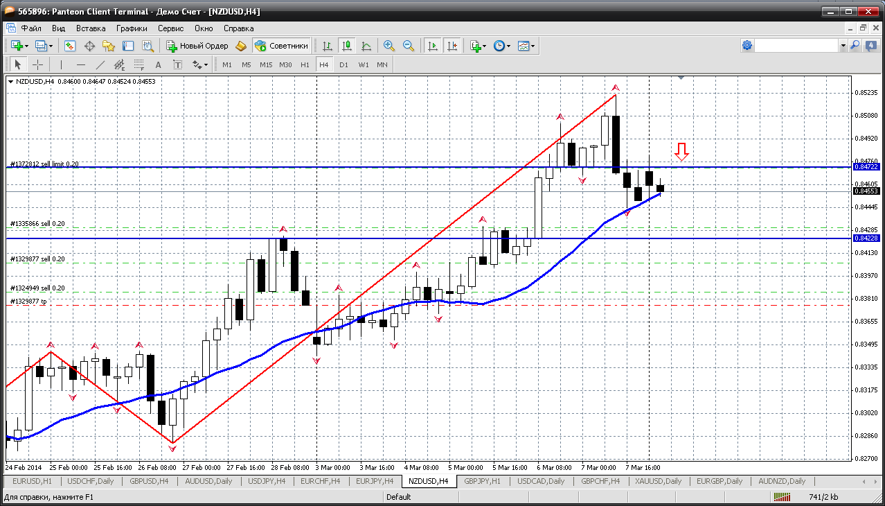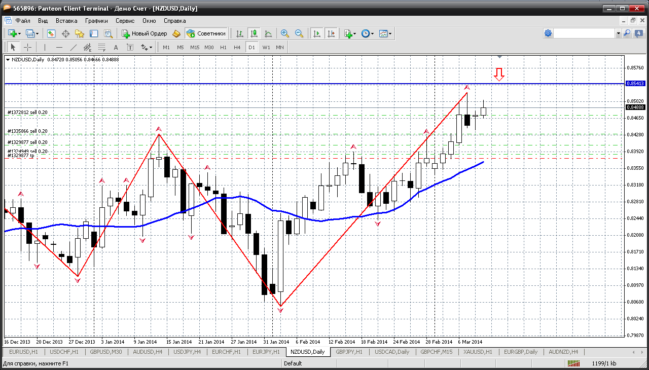 Новозеландец....пара, по которой все понятно - будет падение. Поэтому просто ждем. Особо делать уже ничего и не надо. Выставили отложку (на продажу) на последнюю вершинку - 0.8544 (а это к тому же и третье сопротивление сегодняшнего дня) и ждем. Снижение может быть как с текущих, так и после последнего "салюта" к указанному уровню.... от 0.8544 Прикрепленные файлы: