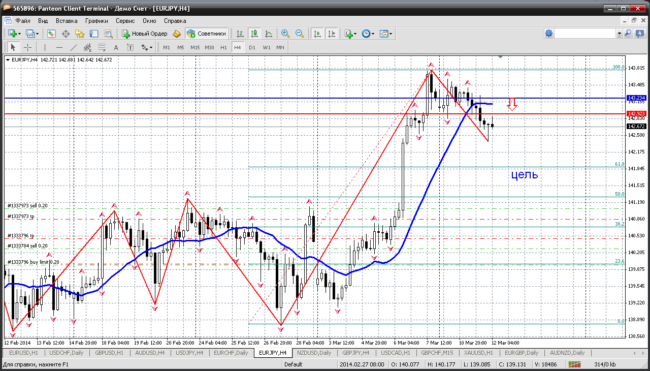 Далее, несравненная евро-йена. Как ни пыжилась, ни бычилась, все же понемногу снижается (весь рост был не что иное как реакция на болтовню, ничего серьезного). А вчера день закрыли ниже 142.87 (серьезная поддержка, понедельник-вторник цену держала). Так вот сегодня при возврате к этому уровню, а там еще и пивот 142.92 расположен, можно продавать. 143, скорее всего потеряли, ну если только еще разок хвоста кинут.... Прикрепленные файлы: