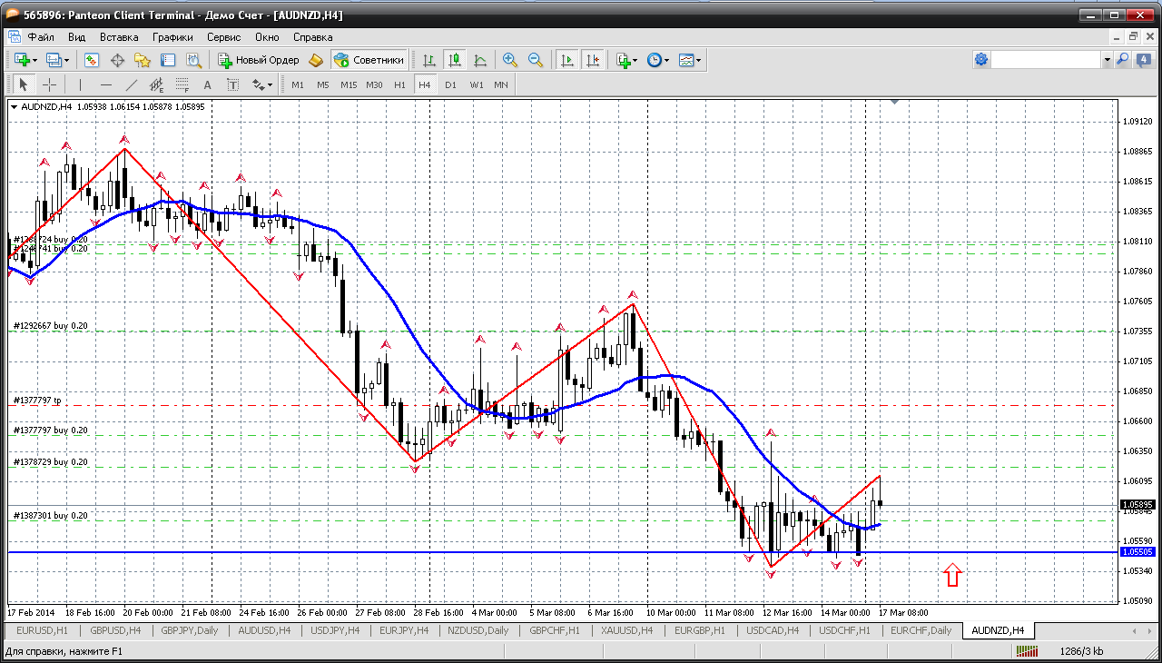 Далее - Австр.-НЗД....пока цена выше 1.0550 пару надо покупать (не было цен закрытия дня ниже). Посему при любом снижении в этот район, пару надо выкупать. Сегодня пара продемонстрировала желание расти и протестировала уровень выше 1.0610 и закрепилась выше мувинга на Н4. Получается на откате к 1.0582 можно открывать покупку....если депозит не перегружен. Прикрепленные файлы: