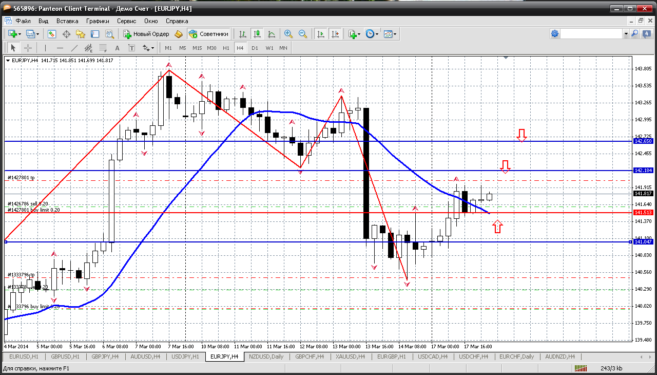 Наиболее волатильна, как обычно, евро-йенка. Цена преодолела мувинг на Н4 (хотя он по прежнему смотрит на снижение). Так вот можно попробовать купить пару при снижении к 141.51 (пивот сегодняшнего дня). Есть подозрение, что пойдут в фигуру 142, а вот оттуда, от сопротивлений - 142.18 или безопаснее 142.65 будем искать возможность продаж Прикрепленные файлы: