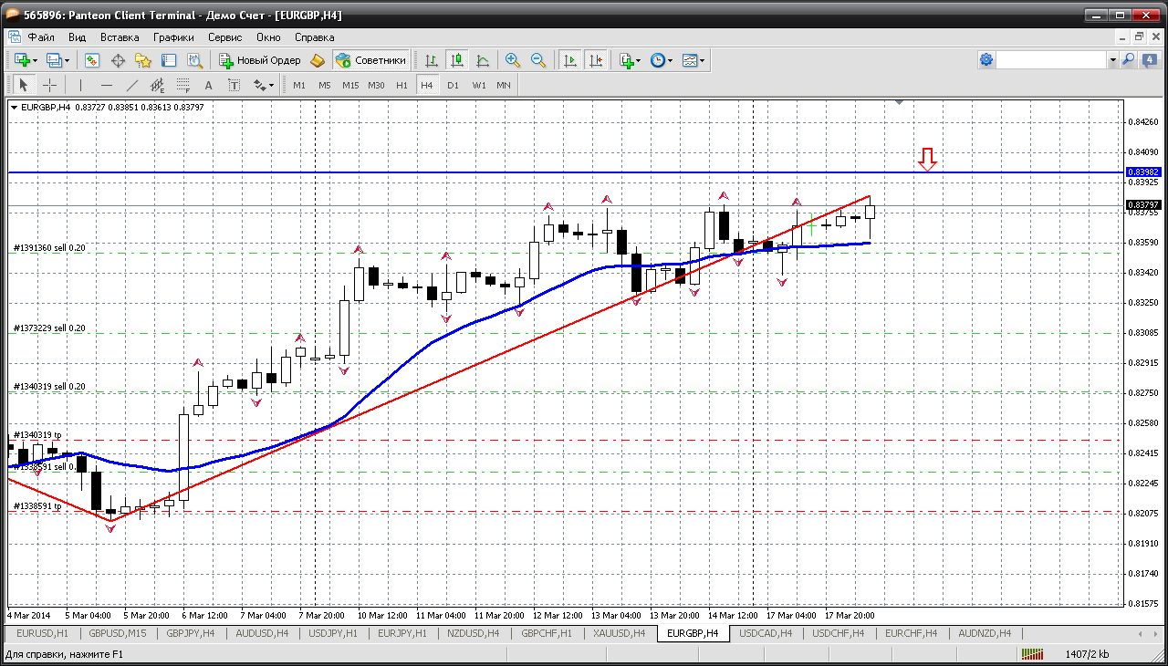 Евра серьезно падает и есть подозрение, что и евро-фунт вот вот начнет тоже приличное снижение. Пара уже просто не может расти. Вроде и рисует растущие свечи, но посмотрите на Н4 и ярко видно, что уже две недели цена все бьется об зону 0.8370-0.8380 и выше никак не получается. Потихоньку можно наращивать продажи. Может упасть неожиданно и сильно. Вот и сегодня два сильных сопротивления 0.8383 и 0.8398....от каждого из них возможно снижение Прикрепленные файлы: