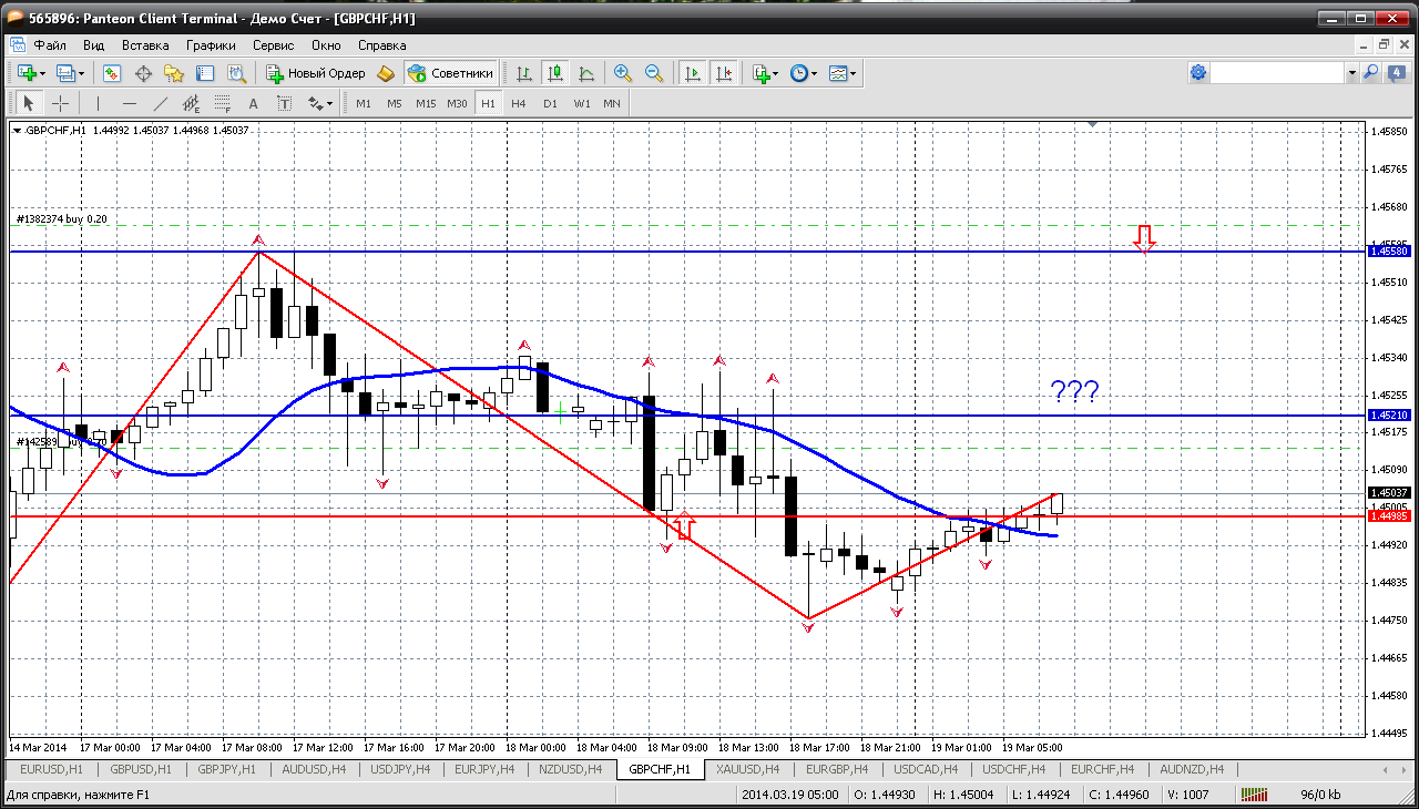 Фунт-франк...Не покидает меня желание пару покупать. Вот и сейчас цена выше мувинга на Н1. И можно открывать покупку при тесте этого мувинга от 1.4493 примерно. Тем более, что в этом же районе и пивот сегодняшнего дня 1.4499. Поддержку 1.4462 можем и не увидеть для покупок.