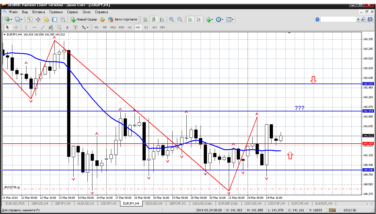 Евро-йена....тоже не очень с выбранным направление, мувинг на Н4 идет параллельно полу.... Но цена сейчас закрепилась выше мувинга на Н4. Поэтому, думаю, что по паре надо искать возможность покупать. И вполне можно при возврате к уровню пивот 141.36 или при тесте мувинга 141.21....конечно, можно и поддержку ждать, но это 140.84 - можем не увидеть такую глябину...