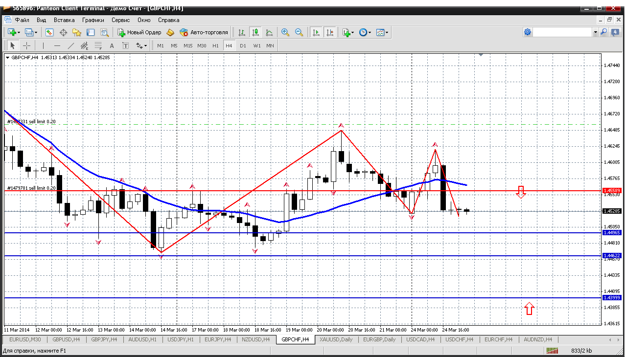 Далее - фунт - франк. Вчера и купить себя дал и продать. Но свеча за вчерашний день вроде как о продажах сигналит. И ни о каких сопротивлениях даже не думаем. Максимум, что можем увидеть - это тест уровня пивот 1.4559. От него и продаем.....