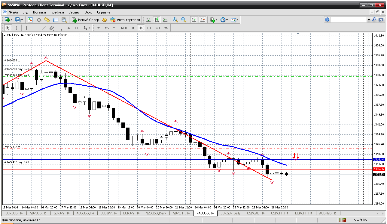 Далее - золото. Ох уж этот инструмент для любителей острых ощущений. Цена обновляет низы ежедневно. И если еще недавно цифра 1300 выглядела чем то фантастическим и недосягаемым, то сегодня ближайшая цель снижения 1296 и это только ближайшая, а есть и ниже....а уровень для продажи 1306.41 (пивот сегодняшнего дня) уже тестировали - могут и вниз пойти на целый день. Но жду все таки сопротивления 1314.17, а там может и продам Прикрепленные файлы: