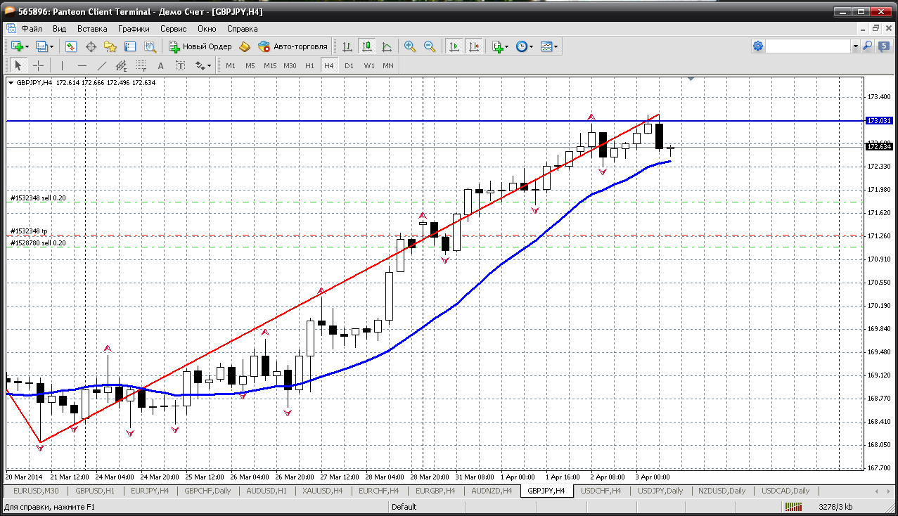 Фунт - йена...шустрячок наш. Не успел я эту пару отработать, а она протестировала приличный внутредневной уровень 173.03. Сам по себе уровень 173 серьезный, так еще там сегодня расположено первое расчетное сопротивление 173.03....и теперь не понятно, при втором тесте продавать ??? или при втором тесте уйдут выше, к следующему сопротивлению 173.36.....на подходе цены и будем принимать решение.... Прикрепленные файлы: