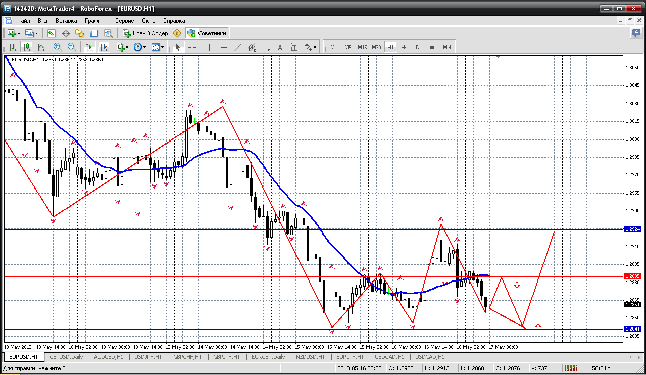 17.05. Евра. С утра обозначила для себя уровень сопротивления - 1.2885. И думаю, вокруг этой цены и можно строить планы торгов на сегодня.