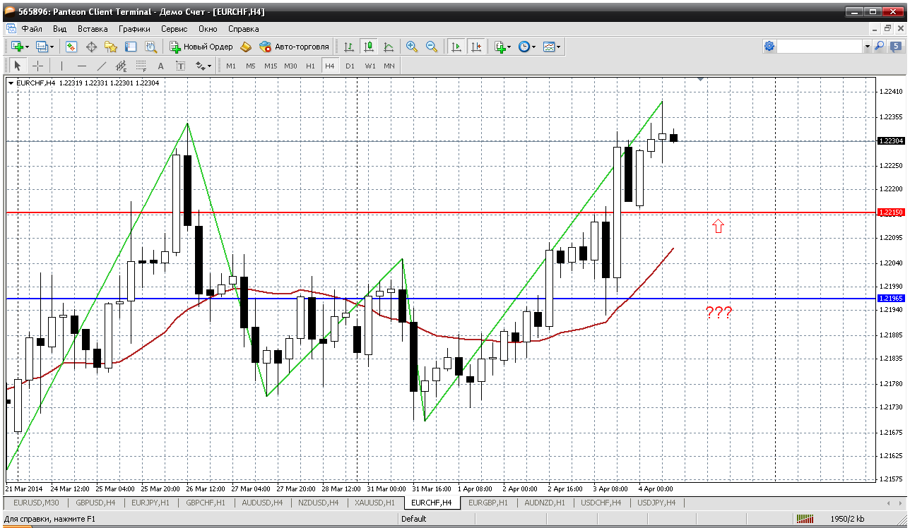 Евро франк...после пятницы очень хотелось пару продавать (свеча дневная просто кричала нам об этом). Но снижение было столь стремительным, что прошло без нас. Ну да ладно, сейчас цена на подходе к важному уровню, от которого и купить уже можно. 1.2198 - поддержка внутри дня....рядом и 61.8 % фибоуровень отката от последнего роста....ну и сам по себе уровень 1.22 серьезный....так что покупаем. Прикрепленные файлы: