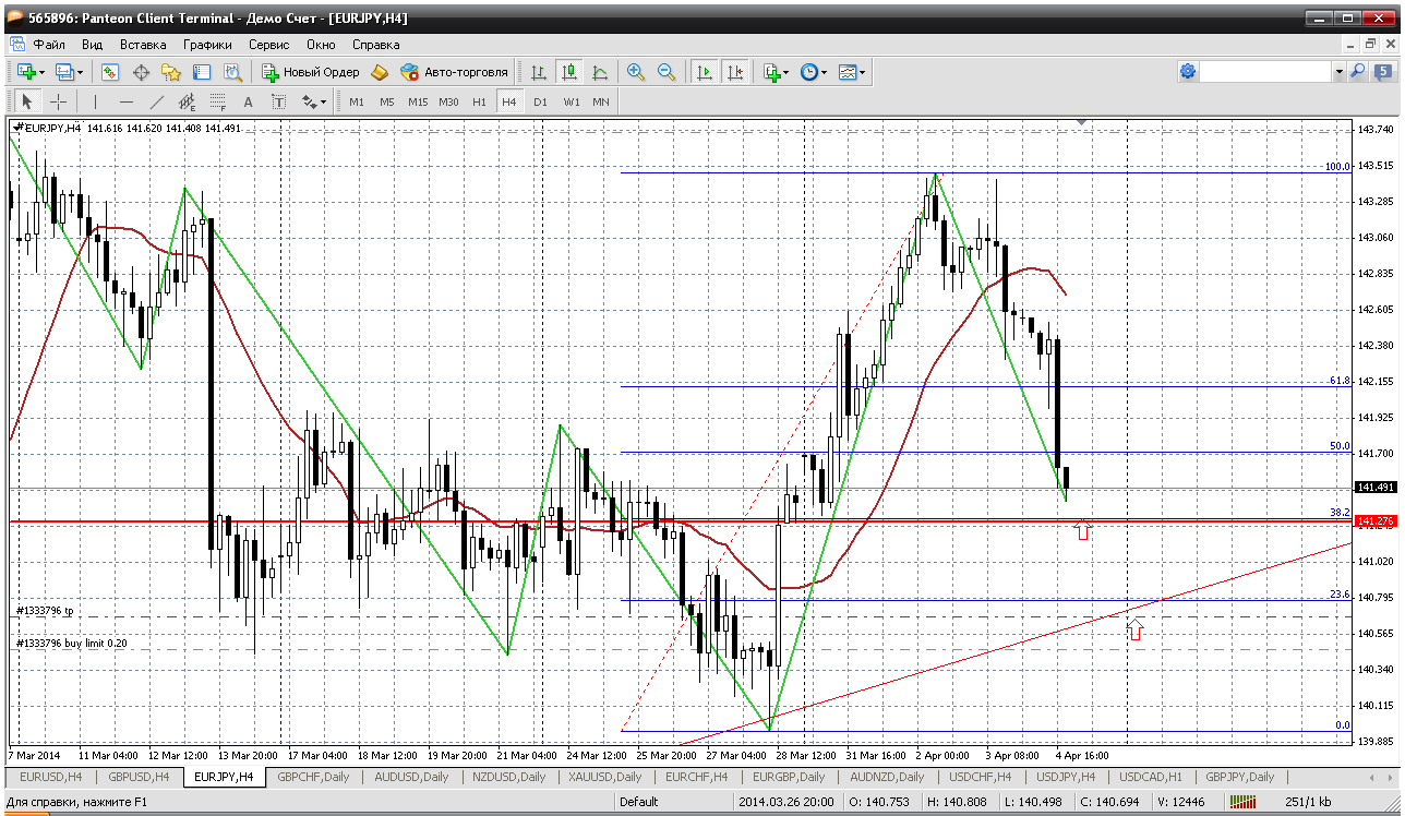 Евро - йена....а что ждать нам от этой пары? Последние пару дней идет снижение и спустилась уже почти на 200 пунктов. Но глядя на ТФ Н4 и дневной видно, что все это снижение есть только откат, а основное движение направлено на север. Так на Н4 пара даже не достигла уровня 61.8% отката по фибо. Получается продолжение снижения, но небольшое, до 141.27 и возобновление роста. У меня так получается. Прикрепленные файлы: