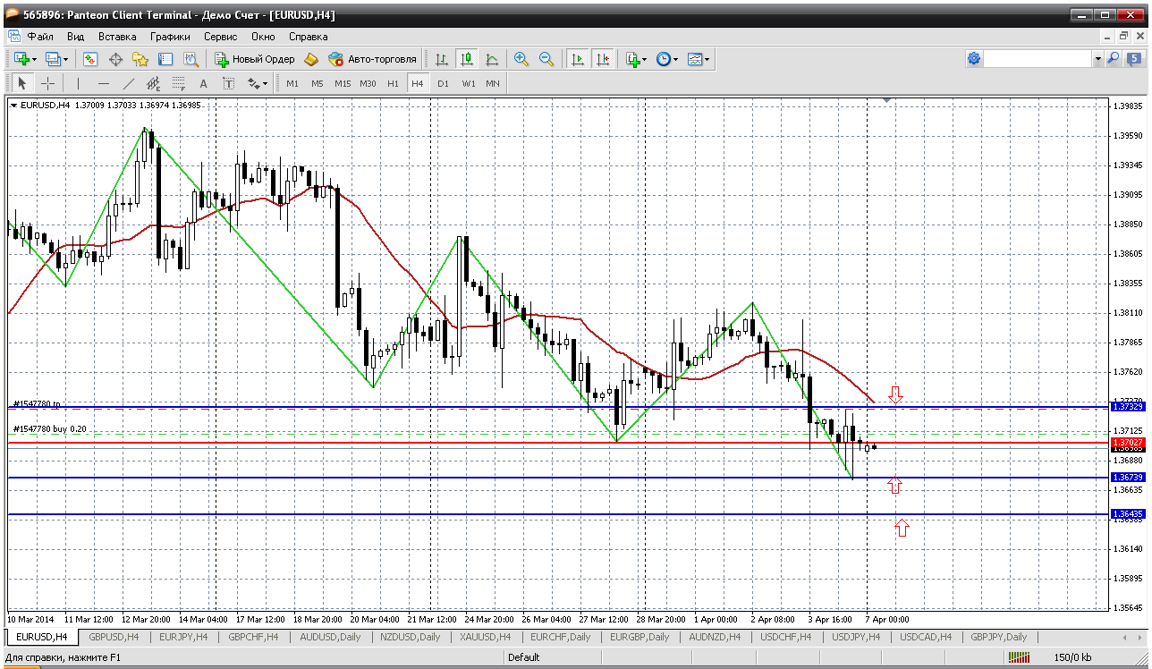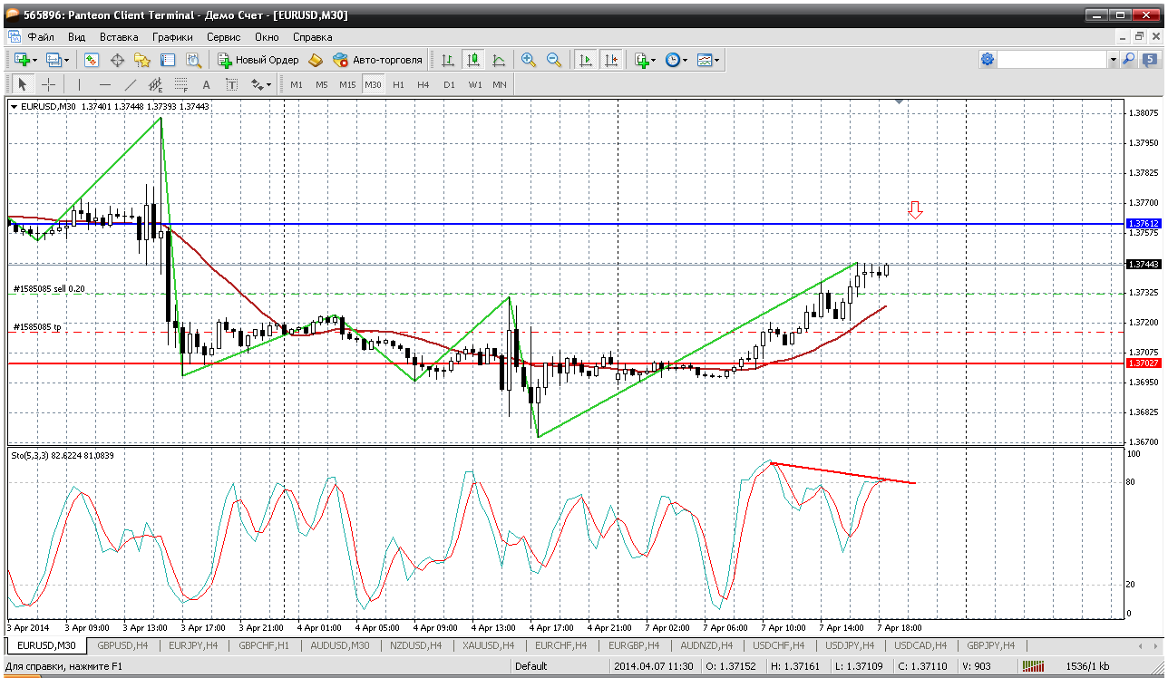 Есть желание к вечеру вернуться к евре. Пара не дала нам поддержки для покупки утром, пошла практически от цены открытия дня....потом от первого сопротивления снизилась недостаточно (я так считаю), а теперь замерла чуть выше первого 1.3732 и чуть чуть не дойдя до второго 1.3761....и сейчас масса вариантов: просто ждать или снижения или второго сопротивления. Но за это 2-ух часовое стояние породило уже приличный дивер на М30...поэтому, если ждать не хочется, то можно прямо с текущих, от 1.3746 пару продать. Обосновано получается Прикрепленные файлы: