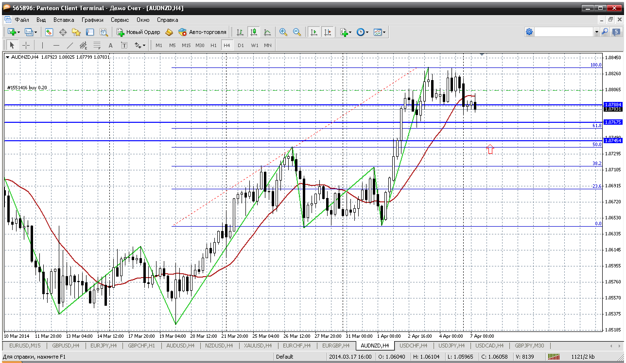 Австралиец - новозеландец....паре все же не позволили закрепиться в фигуре 1.08. Нужен откат. Сейчас цена ниже уровня 1.08 и ниже мувинга на Н4. Тогда смотрим следующие цели коррекции и получается вполне реально снижение до 50% отката по фибо. А там же и третье сопротивление внутри дня 1.0745. Получается, что покупки раньше этого уровня опасны... Прикрепленные файлы: