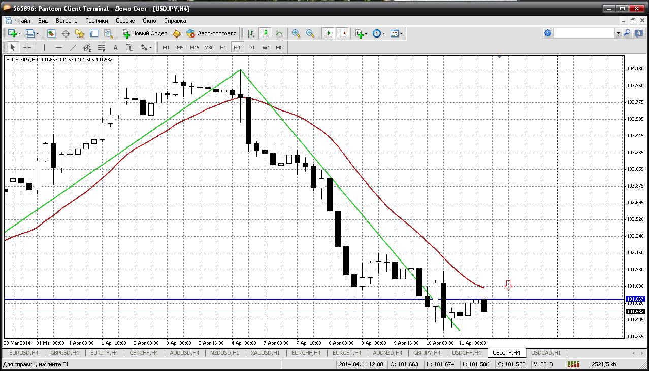 Далее доллар - йена. Пока до неё дошли, а уже были цены по которым можно было бы продавать пару. 101.66 - пивот дня, а так же тест мувинга на Н4 (примерно 101.81)....если еще разок протестируют эти уровни - то продаем не задумываясь. Есть подозрение теста отметки 101.00. У меня так получается Прикрепленные файлы: