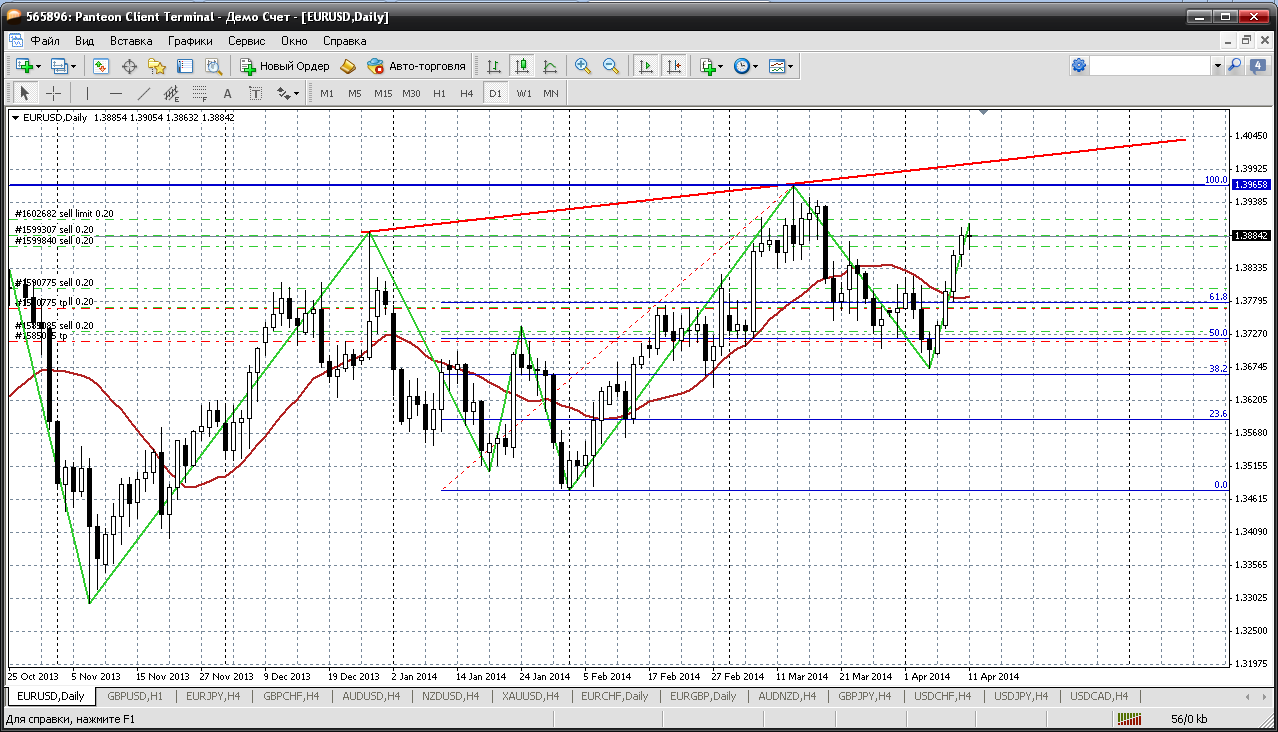 Евробакс...ситуация какая то мутная. Кажется растет, кажется в тренде. Но как то скромно. Вчерашний диапазон 63 пипса и это нельзя назвать приличным ростом. Сегодня можно попробовать купить от 1.3873 (пивот дня), но что то откатываться совсем не хотят... продать можно от 1.3911 - первое расчетное сопротивление внутри дня, а так же и 161.8 % роста по фибо на Н4 Прикрепленные файлы: