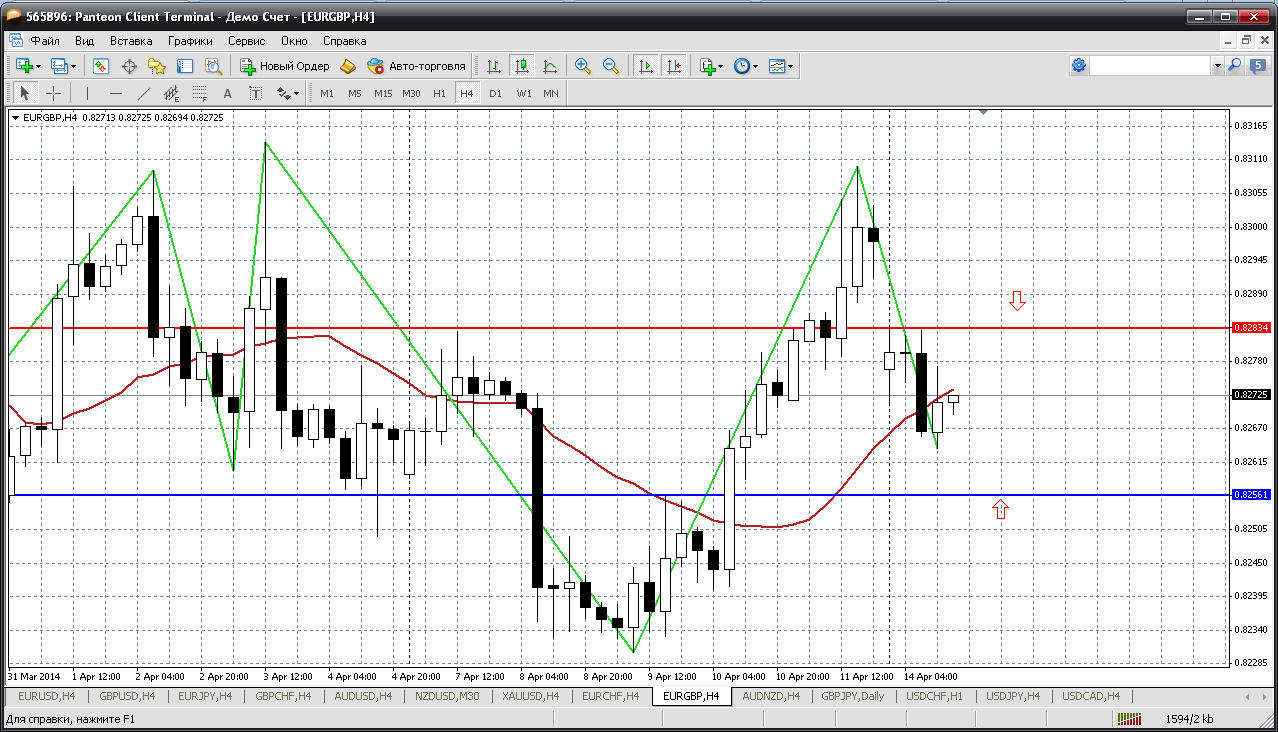 А вот евро - фунт вполне может что нибудь получиться. Утренний ГЭП на всех евровых парах, естественно, оказал влияние на торги в течении всего дня. И по паре сложилась следующая ситуация: сверху движение ограничено уровнем 0.8283 - это у нас пивот сегодняшнего дня и зона ГЭПа, а снизу первая поддержка внутри дня 0.8256. Вот в этом диапазоне и торгуем: от верхов - продаем, от низов - покупаем. Все просто... Прикрепленные файлы: