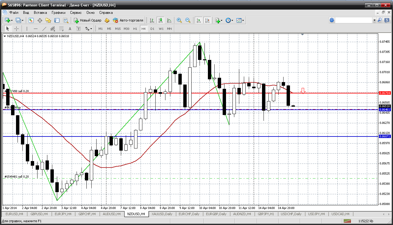 Далее НЗД...эта пара идет своим путем и категорично не хочет с австралийцем "в ногу идти". Прямо антиподы какие то. Итак, пару пробуем продавать. Уж очень все нам об этом сигнализирует и начинать продажи можно от 0.8670 (пивот сегодняшнего дня). Да к тому же и мувинг на Н4 изогнут на продажу и уже вторую неделю сдерживает рост пары....