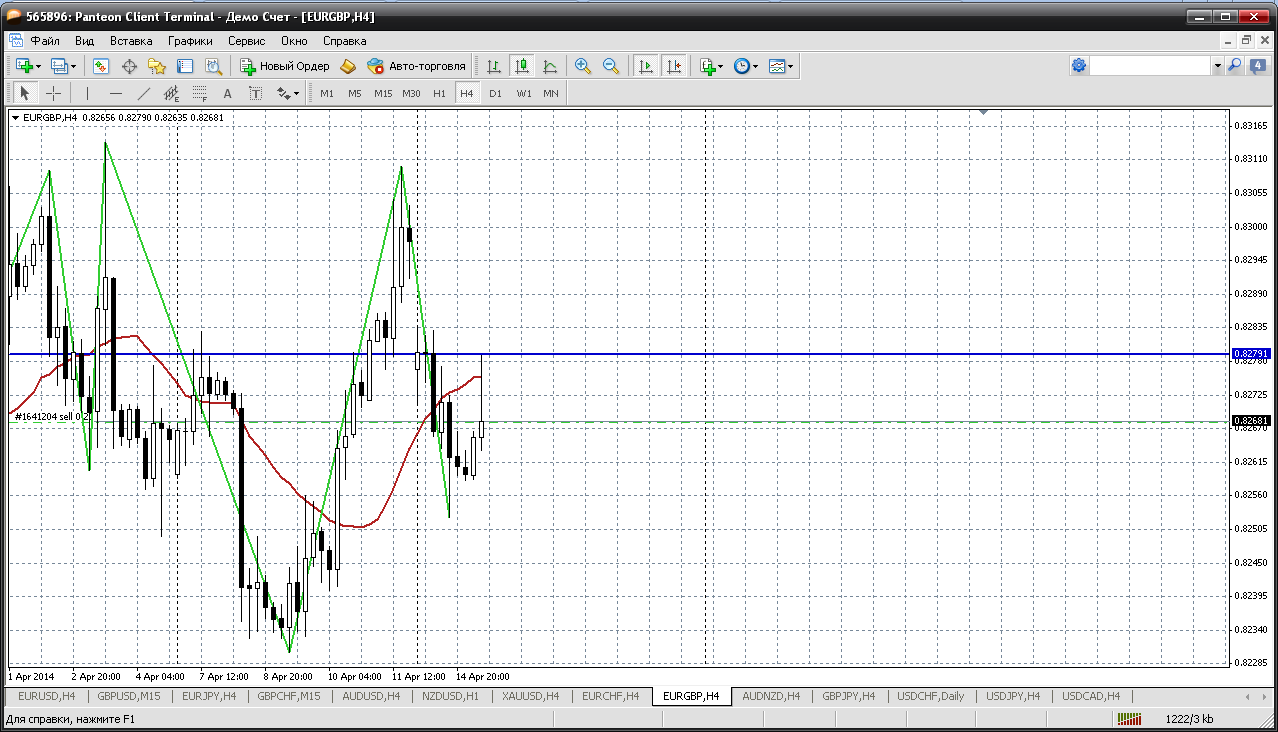 Далее фунт - франк. А его, голубчика, только продавать пока буду. Тем более он предоставляет такие возможности. Вот и сейчас цена подошла к очень даже серьезному уровню 1.4696 - это у нас первое расчетное сопротивление внутри дня, а так же там расположен мувинг на Н4, который сильно развернут на продажу. Получается продажа вполне обоснована и надежна Прикрепленные файлы: