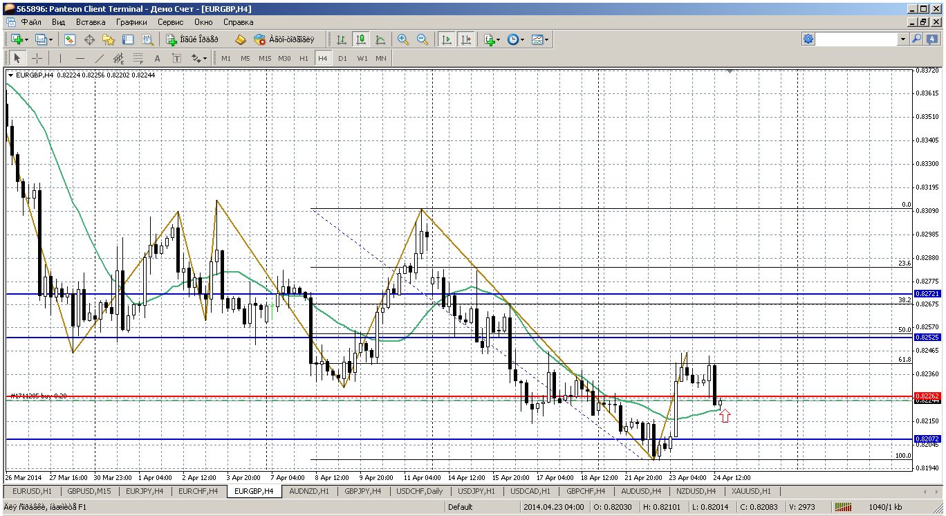 евро - фунт на очереди. По этой паре вот такие мысли и планы. Цена окончательно закрепилась в фигуре 0.82 и вчера на этой волне роста даже сразу взлетел в район 0.8240, даже не заметив при этом мувинг на Н4. Но с этой парой такие полеты без коррекции обычно не проходят. Вот сегодня видим, как цена вернулась к мувингу, а там у нас и пивот дня расположен на 0.8227. По этой цене и покупаем. Прикрепленные файлы: