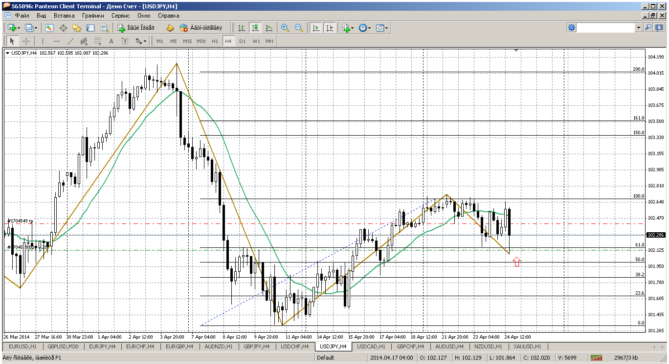 Долла - йена...пара почти протестировала максимум этой неделе от 22 апреля, а потом стремительно снизилась, как впрочем и остальные йеновые пары. И возникла ситуация, когда можно уже искать возможности для покупок. Две поддержки внутри дня 102.23 и 101.94. А примерно в этих же районах расположились уровни по фибо 38.2 и 50 %. От них и можно покупать... Прикрепленные файлы: