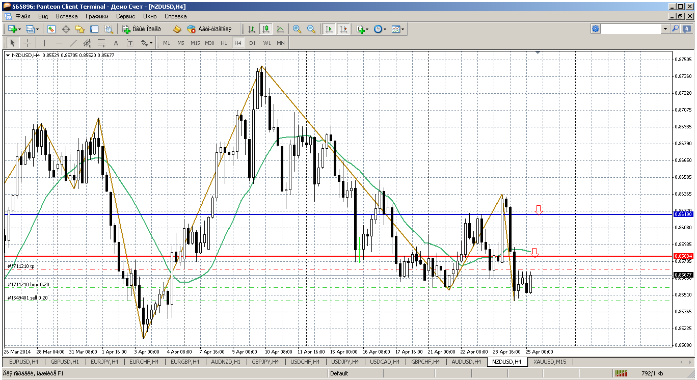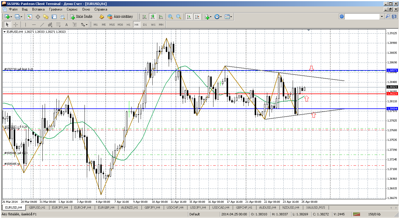 Евра...нормальный ход в 50 пипсов, от верхней границы продаем, от нижней покупаем. Сегодня около ближайших ПС еще и трендовые получились, что значительно усиливает их. Сейчас цена выше мувинга на Н4, который направлен вверх и при возврате к нему от 1.3822 можно открывать покупку. Это у нас пивот дня. А вот ближайшие поддержка и сопротивление как бы прикрыты трендовыми линиями: сопротивление 1.3857, а трендовая проходит примерно на 1.3848....из этой зоны продаем.... поддержка 1.38, а трендовая на 1.3795....это у нас зона покупок Прикрепленные файлы: