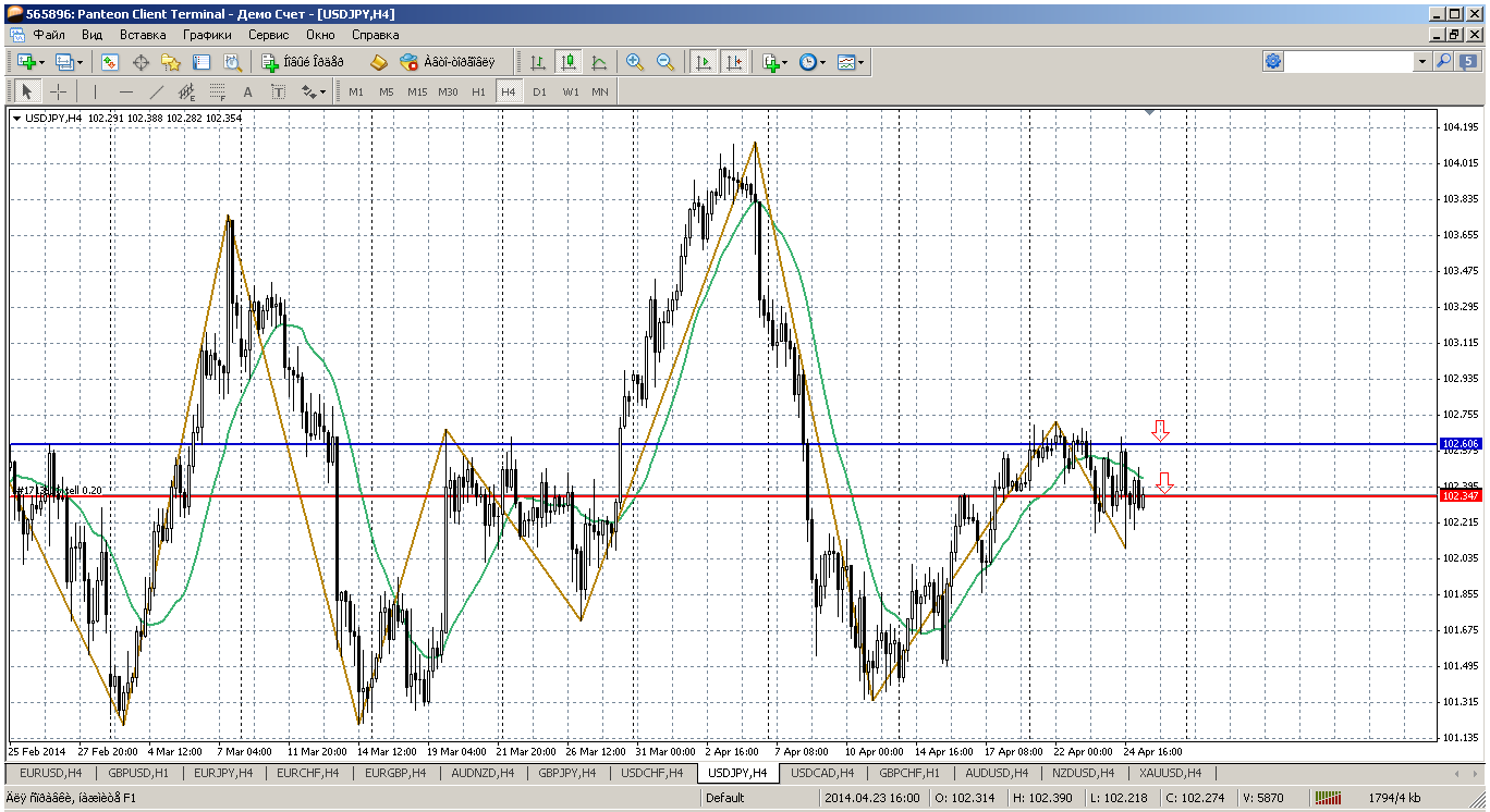 Эту пару с фунто-йеной вроде как продавать надо (ЕЙ что то выбилась из ряда йеновой братии - её покупать у меня получилось). А вот ДЙ можно продавать прямо с текущих от 102.34 - это пивот дня. Обоснование: цена закрепилась ниже мувингов и дневного, и на Н4. С утра пробила пивот и сейчас исполнила технический возврат. Получаем продажу обоснованную, если что не так пойдет, от сопротивления 102.60 усреднять надо будет. Прикрепленные файлы: